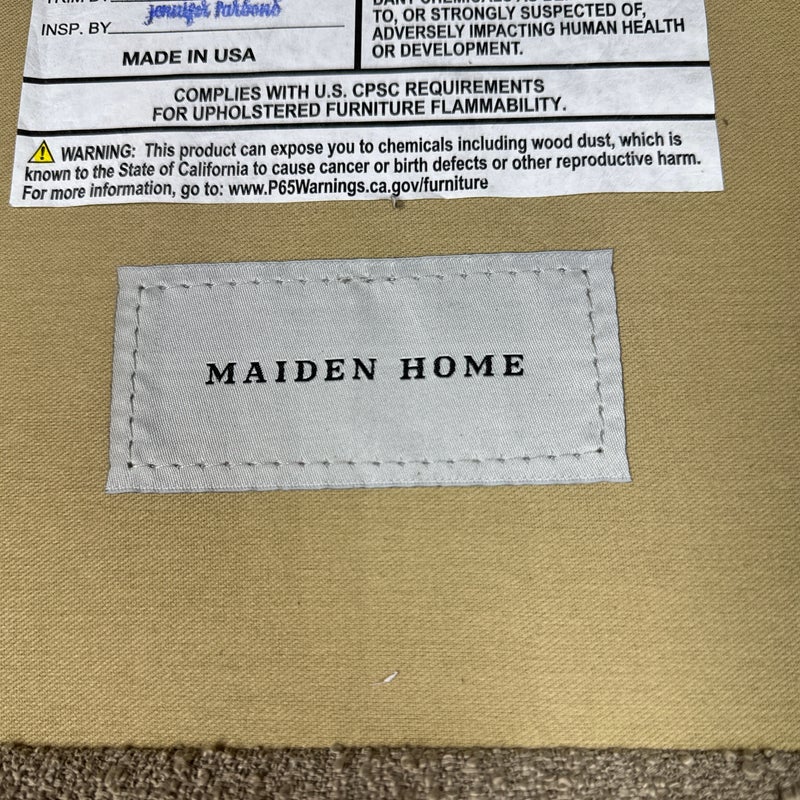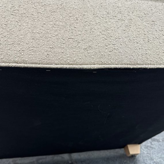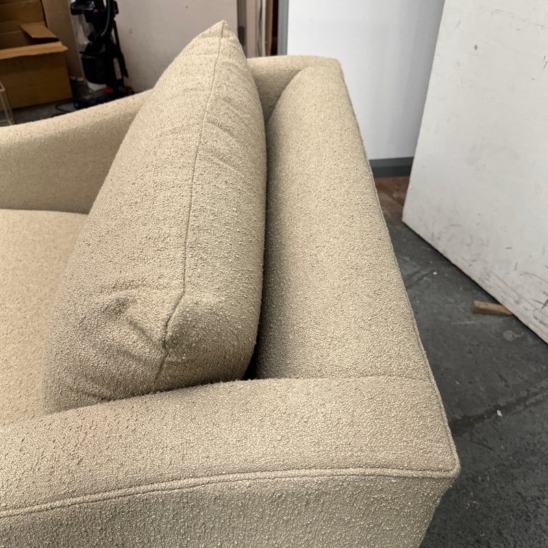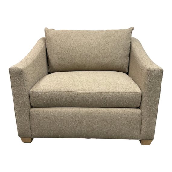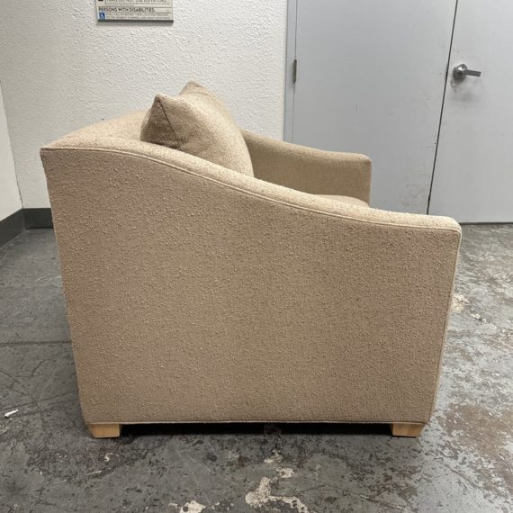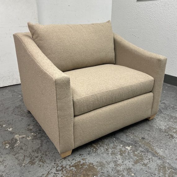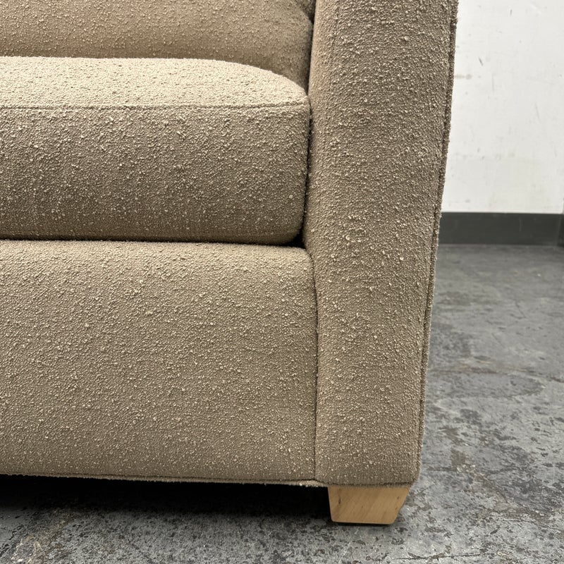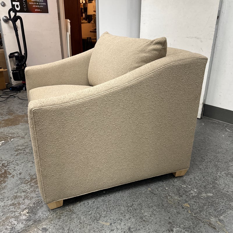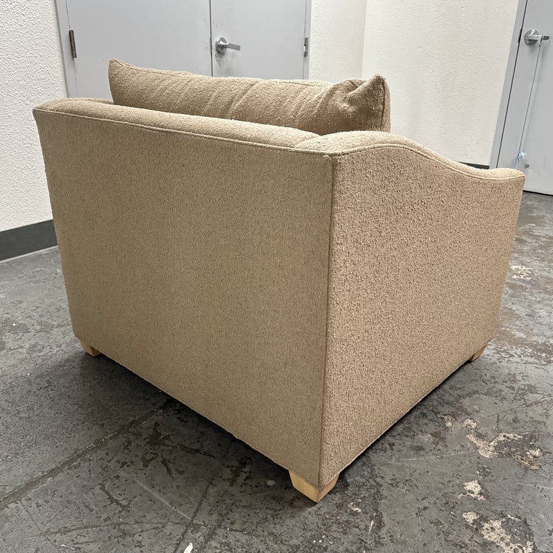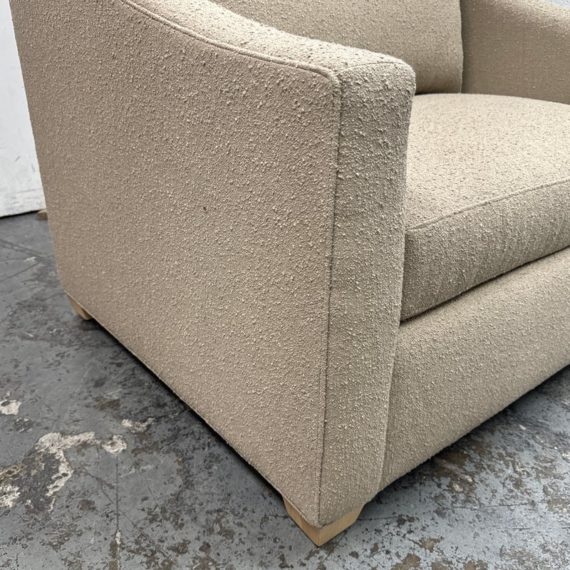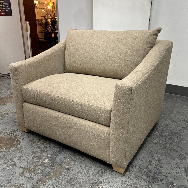 Design plus Gallery presents a Chair and a Half of Custom Made. In a lovely neutral tan performance boucle, versatility is king with this design and color scheme. It has a deep seat framed by sloped shelter arms and sits atop trapezoidal legs for a bold touch. Is in good condition with minimal signs of wear. Made in the USA