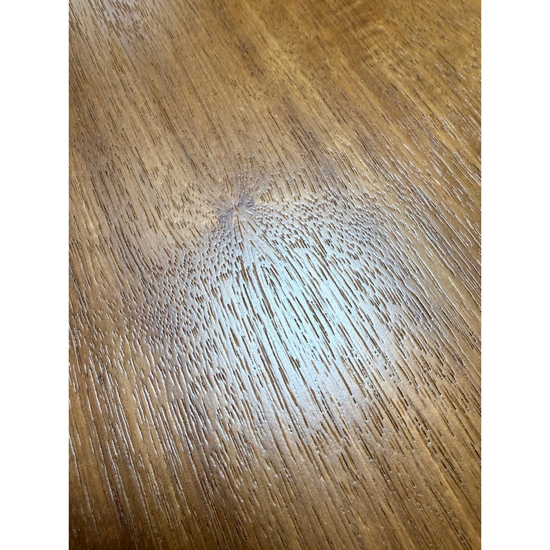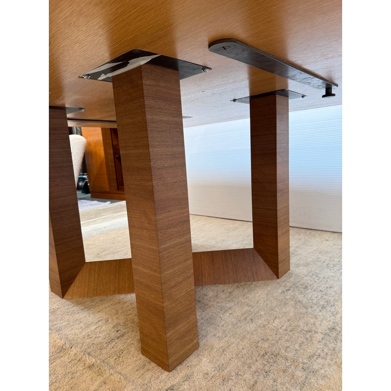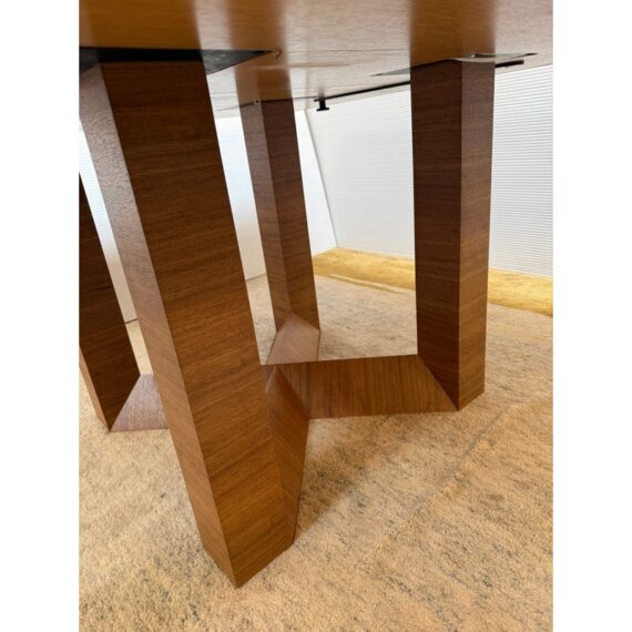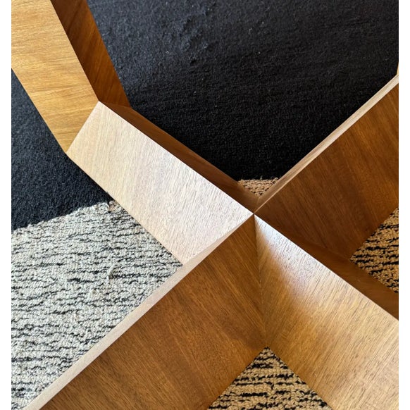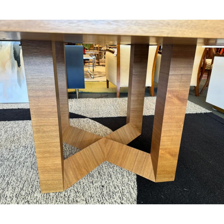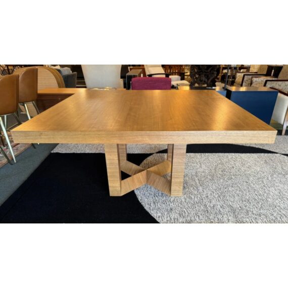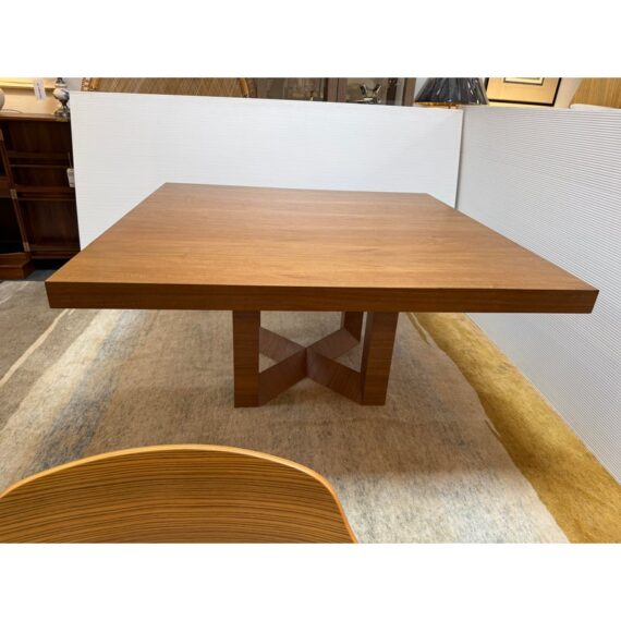 Design Plus Gallery presents a Custom 60 inch Contemporary Dining Table. Five feet in each direction, the natural finished solid wood table is elevated on a beautiful, geometric cross base. Plenty of dining or conferencing for eight. Light surface wear, table condition is good for age and use.