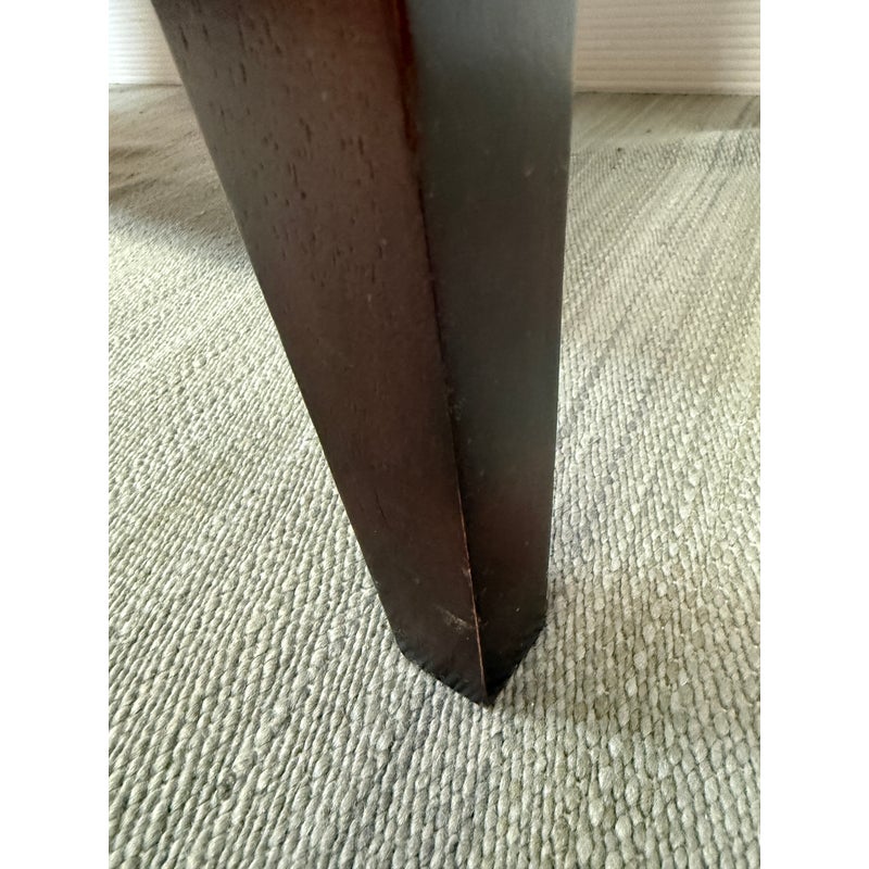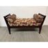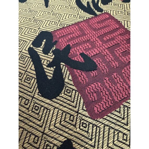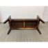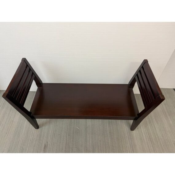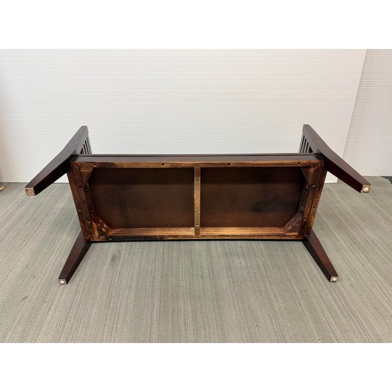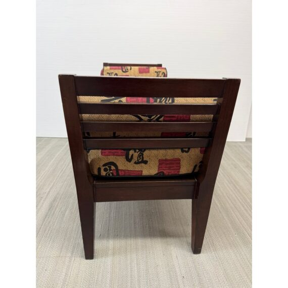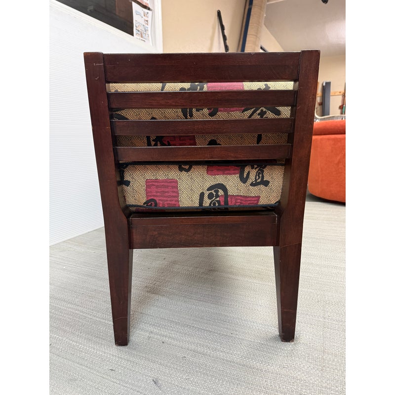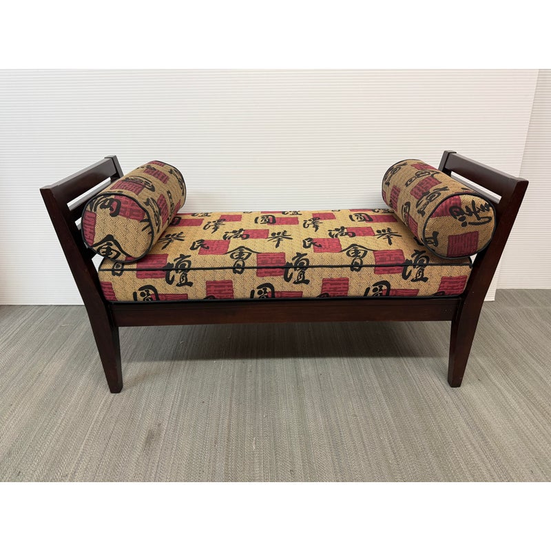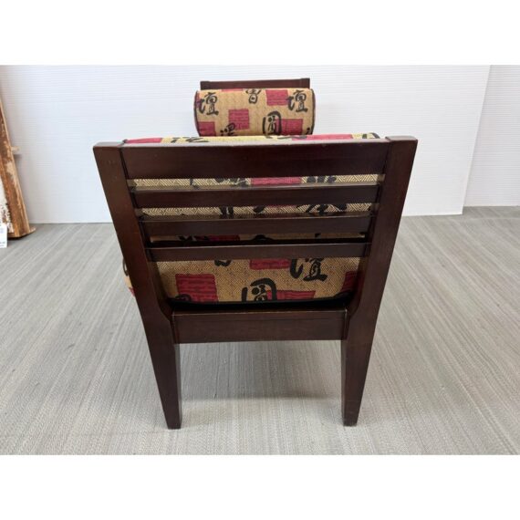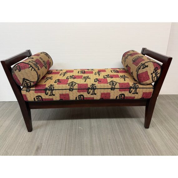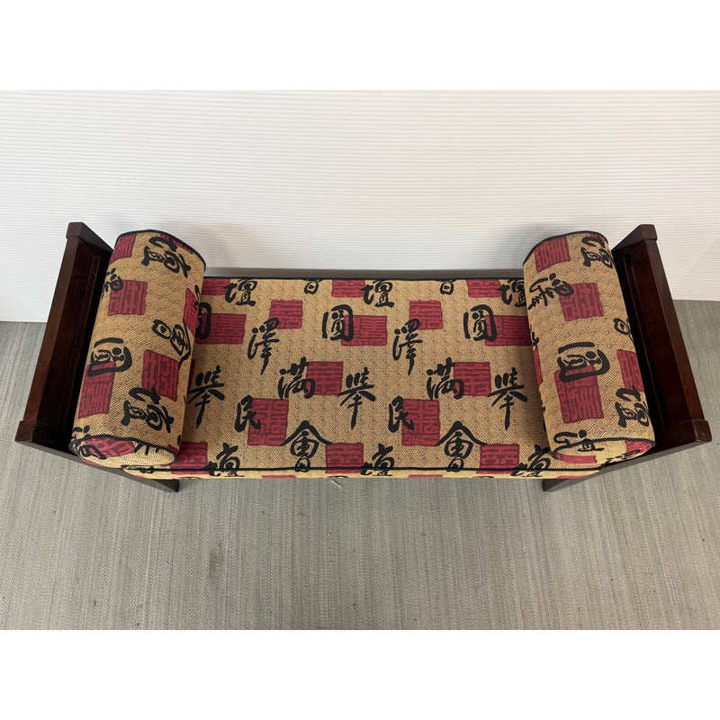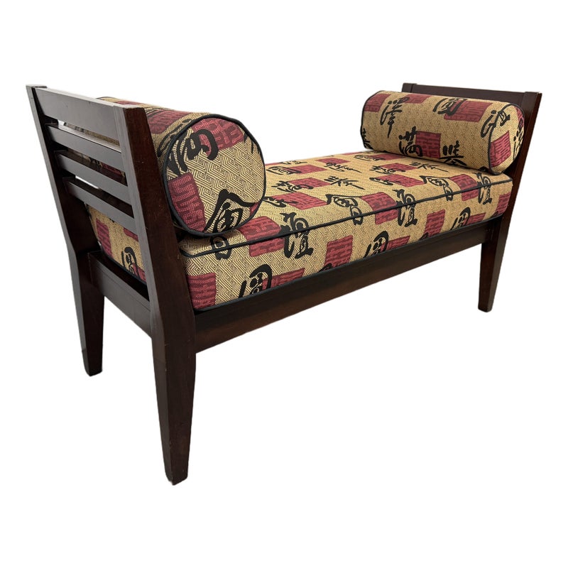 Design Plus Gallery presents an Asian Inspired Bench of Custom Design. A harmonious blend of comfort and Asian-inspired artistry with this bench. Crafted from wood with a mahogany finish, the sturdy frame has flared, tapered legs for a hint of contemporary flair. Two slatted armrests add to the bench’s structural beauty. An inviting, upholstered loose seat cushion ensures plush seating, accompanied by two matching bolster pillows for added support. The upholstery textile is adorned with Chinese black calligraphy and a bold pattern of red squares, all set against a neutral tan background. Whether gracing a living space, a bedroom, or an entryway, this bench is designed to captivate with its fusion of cultural motifs, artisanal craftsmanship, and modern sensibility. In good condition, visible and minimal wear from usage.