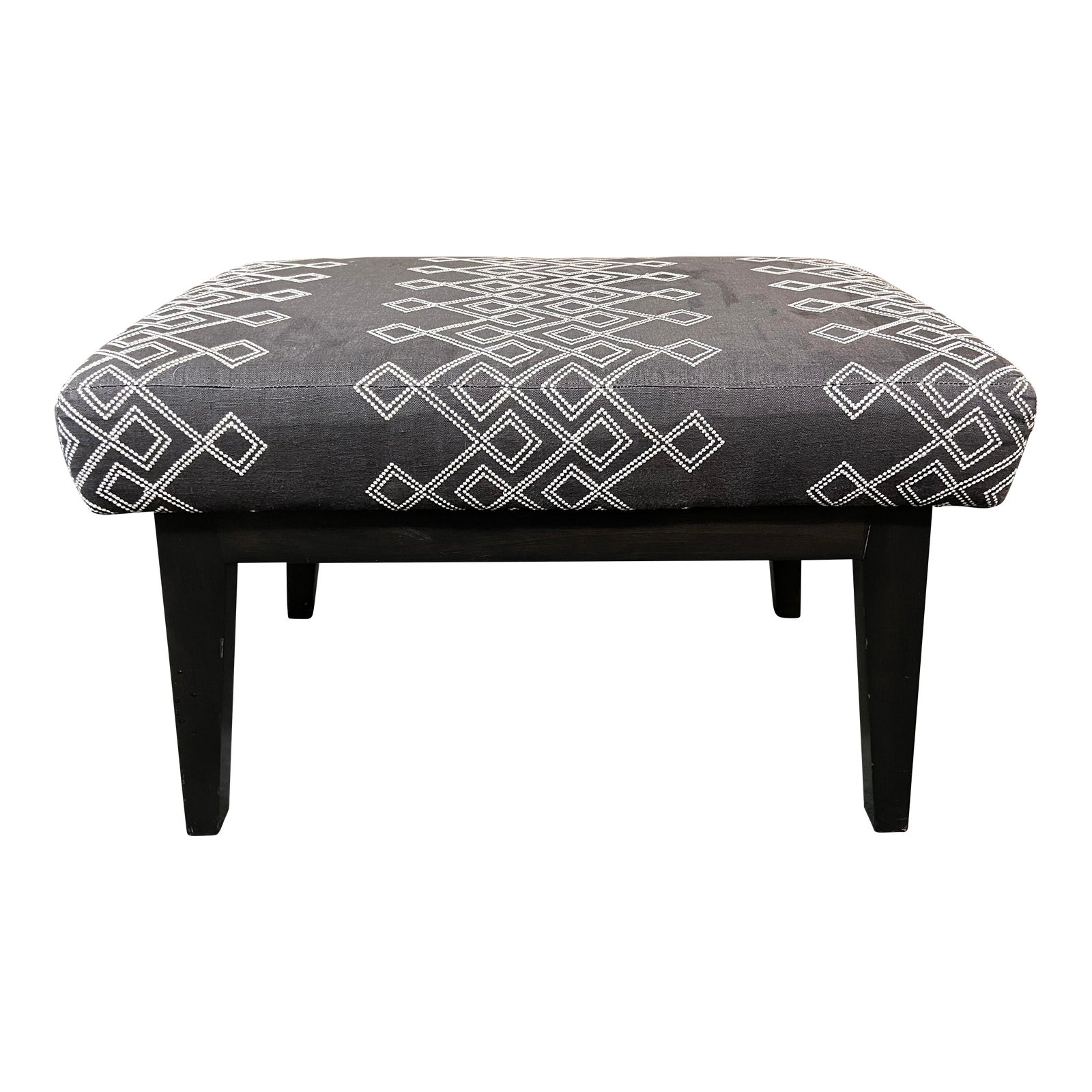 Design Plus Gallery presents the Custom Contemporary Black + White Ottoman/Stool. The base is constructed with wood and given a satin espresso finish. On the ottoman’s upholstery are three rows of a diamond like pattern. The patterns’ lines are formed with dots that can remind of miniature flowers. Minor wear from use; ottoman is in good condition.