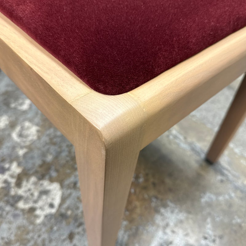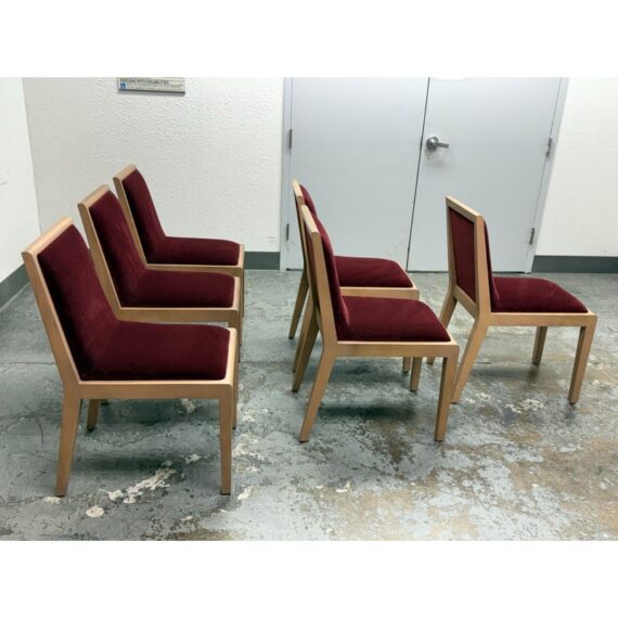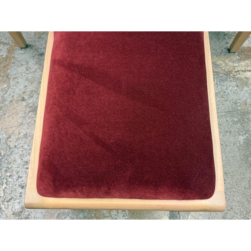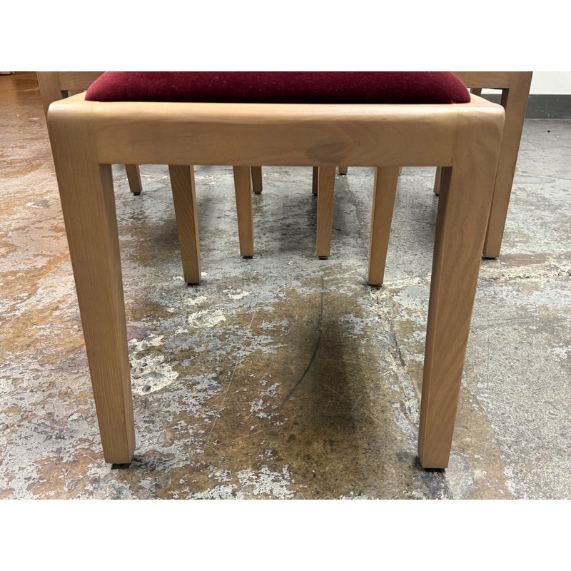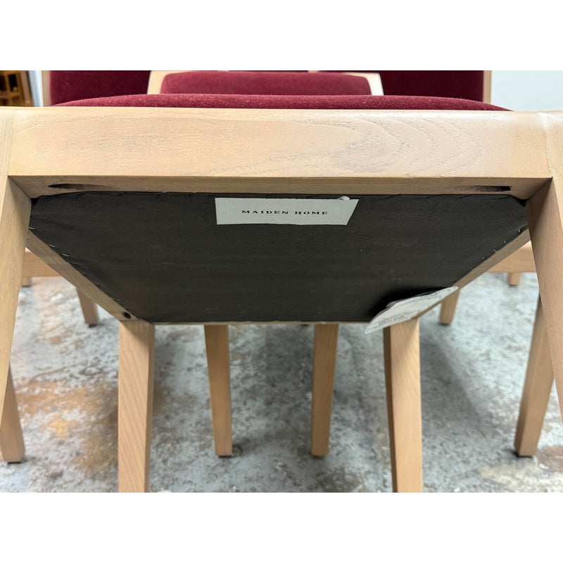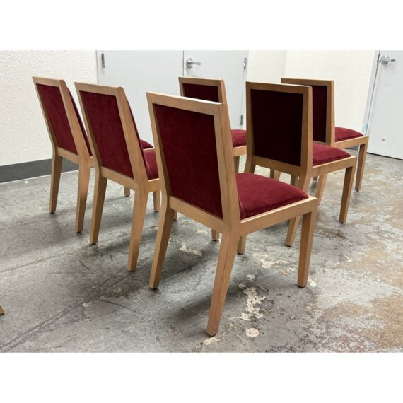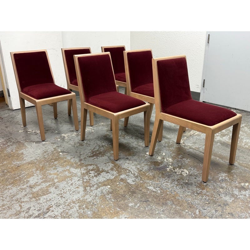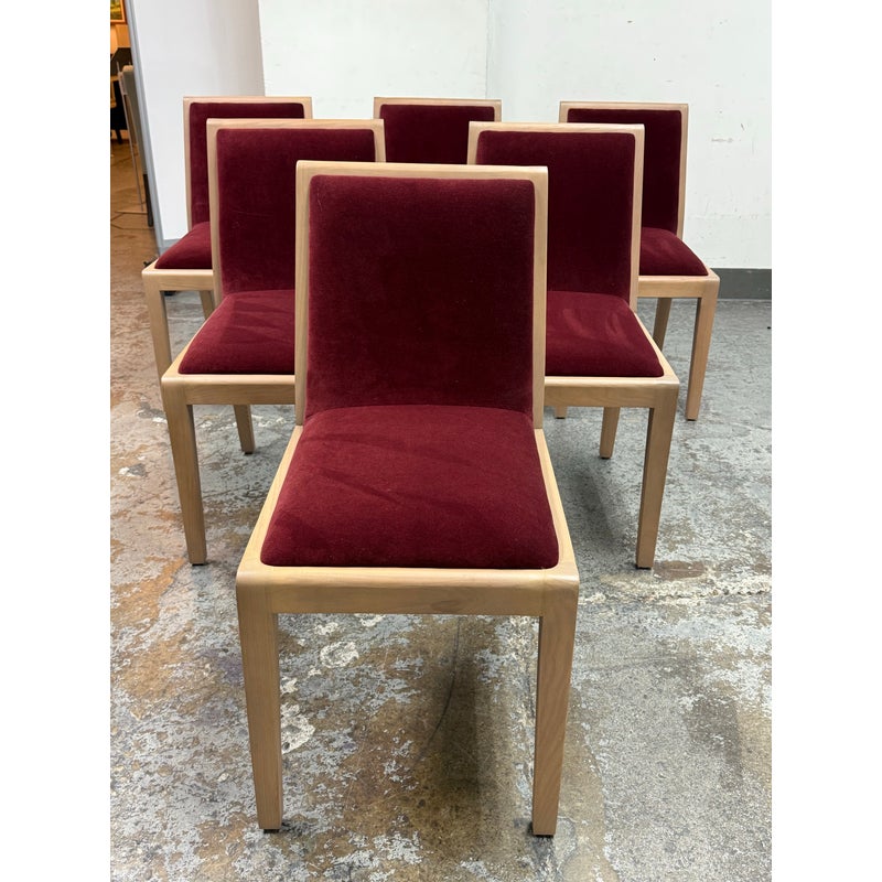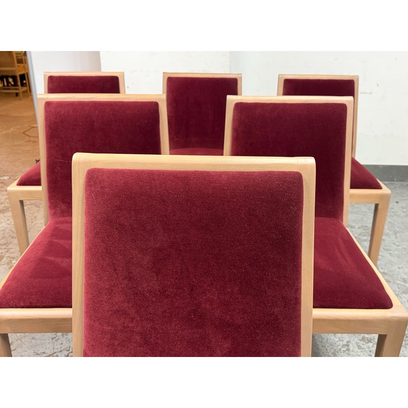 Design Plus Gallery presents a Set of Six Custom Made Dining Chairs of Crimson Mohair with a Natural Driftwood Finish. These chairs are designed with a timeless style that is both traditional and modern. The back and seat are constructed with solid ash and feature subtle curves that create a comfortable, yet contemporary look. The graceful arms and angled legs add strength and visual interest to the design, while the upholstery ensures a comfortable seating experience. They are in good showroom sample condition with wear that is minimal. Made in the USA.