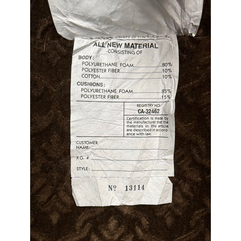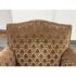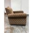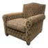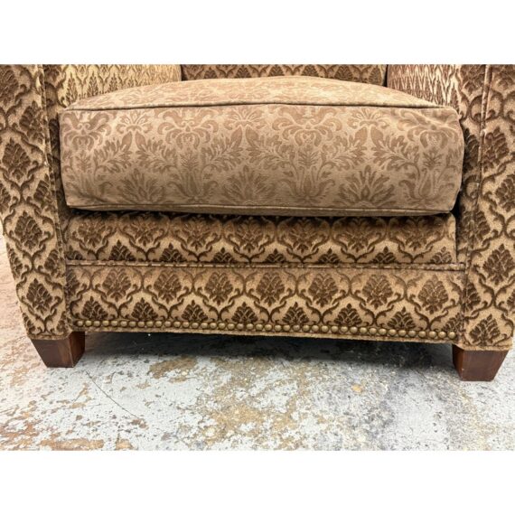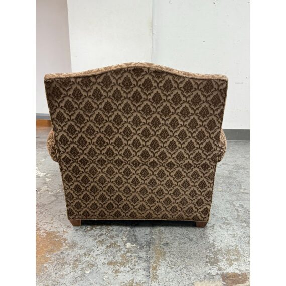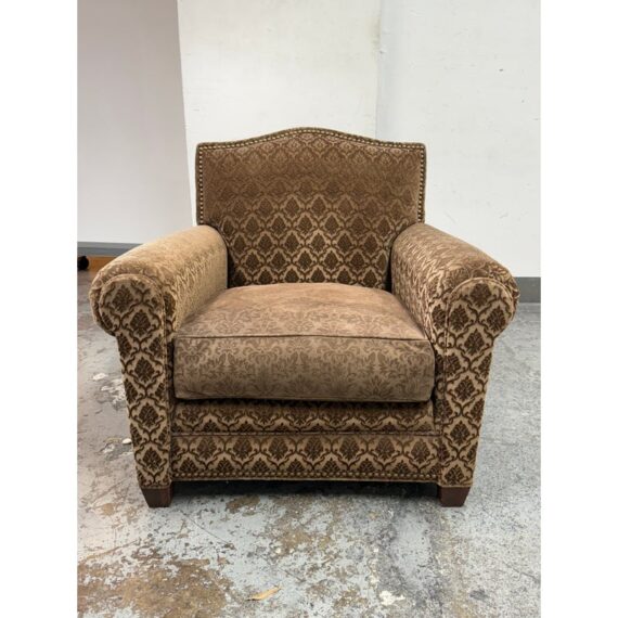 Design Plus Gallery presents a Custom Design Lounge Arm Chair. Upholstered in a cut mohair upholstered with a diamond damask print. The seat cushion is upholstered in a damask print suede. The camel back and base have a gold finish metal nail head trim. In good condition, minimal wear from usage. This is a discontinued model. Made in San Francisco, California, USA.