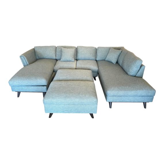 Design Plus Gallery presents a Custom Sectional. This unique sectional is loaded with function and style. The Teal loose-cushion sectional offers flexibility in arranging the ottomans, as well as removing one of the chaise options (shown in photos). The textured woven fabric covers foam filled cushions and contrasts nicely with the dark tapered wood legs (removable for ease of transport). Made in USA.