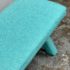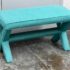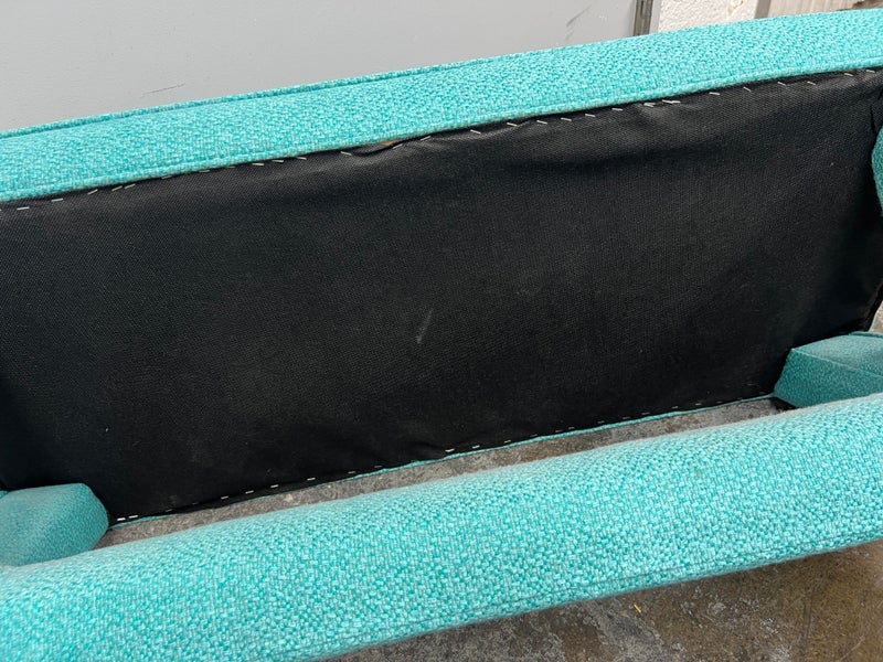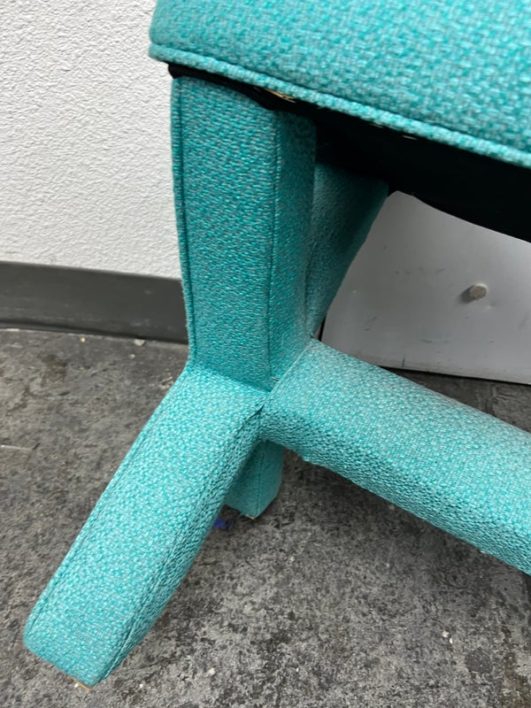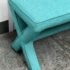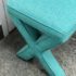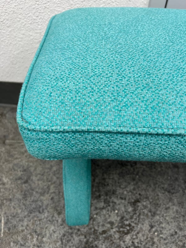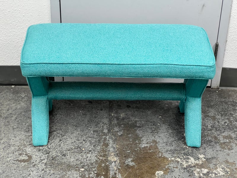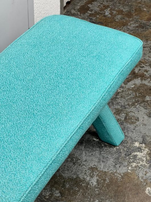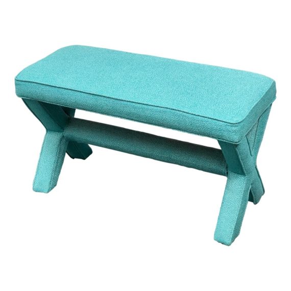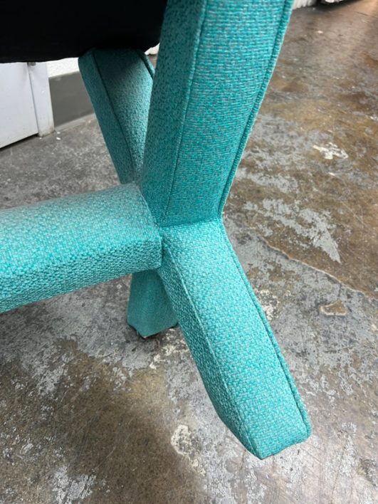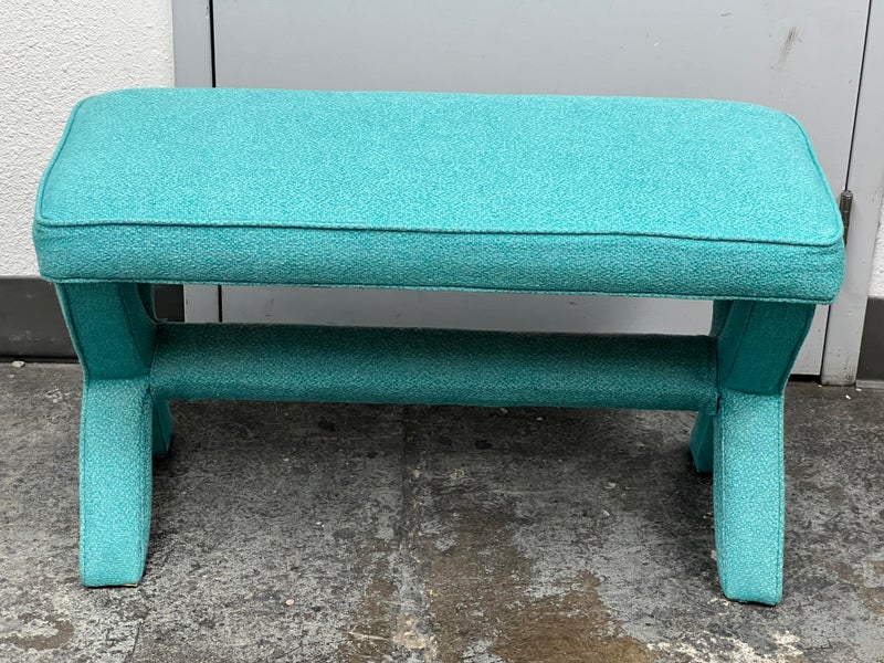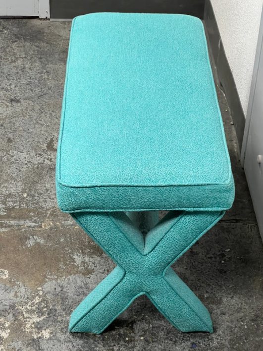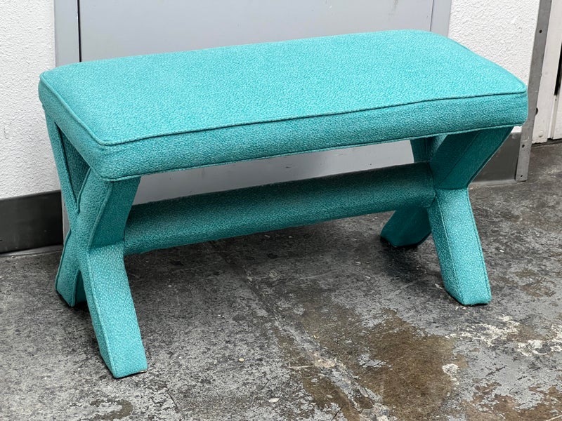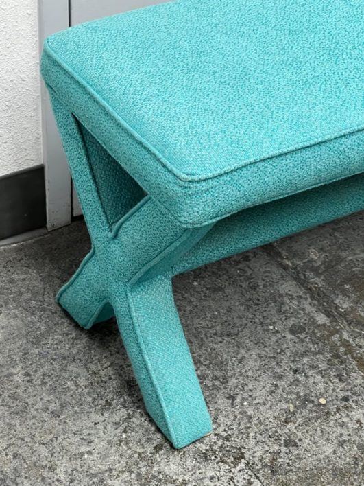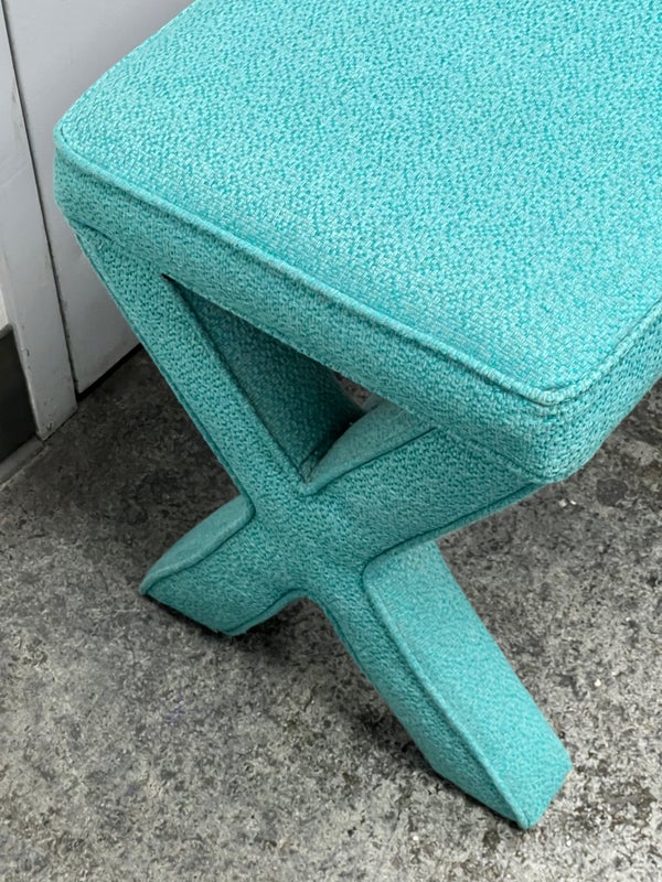 Design Plus Gallery presents Custom Design Double X- Bench. Fully upholstered in a Turquoise fabric. Vibrant and striking in design. In good condition, minimal wear from usage + age.