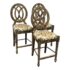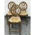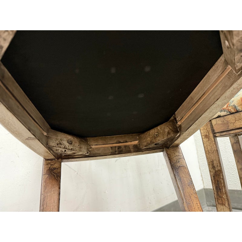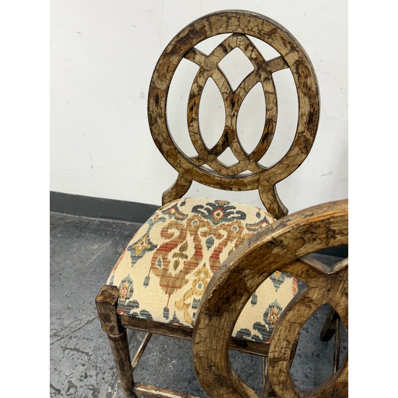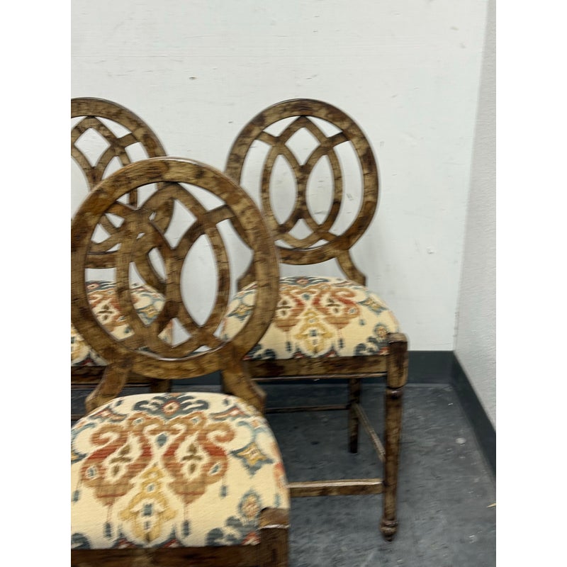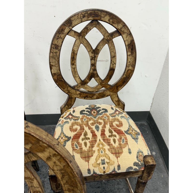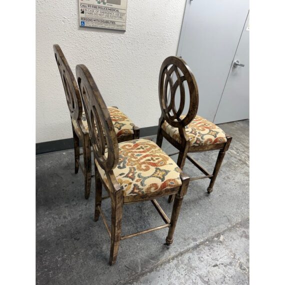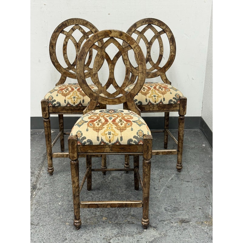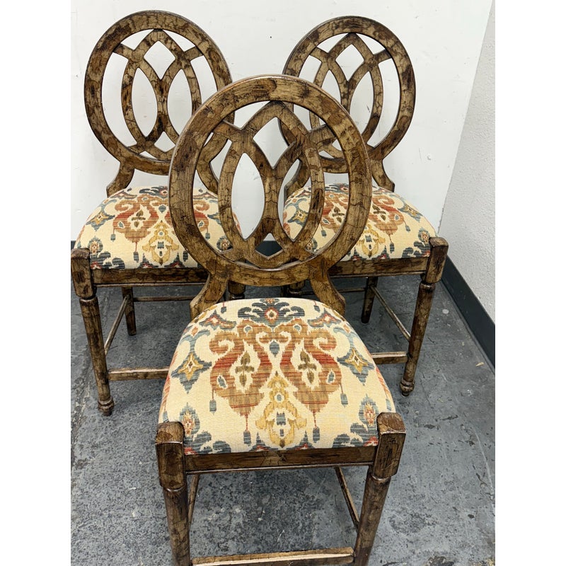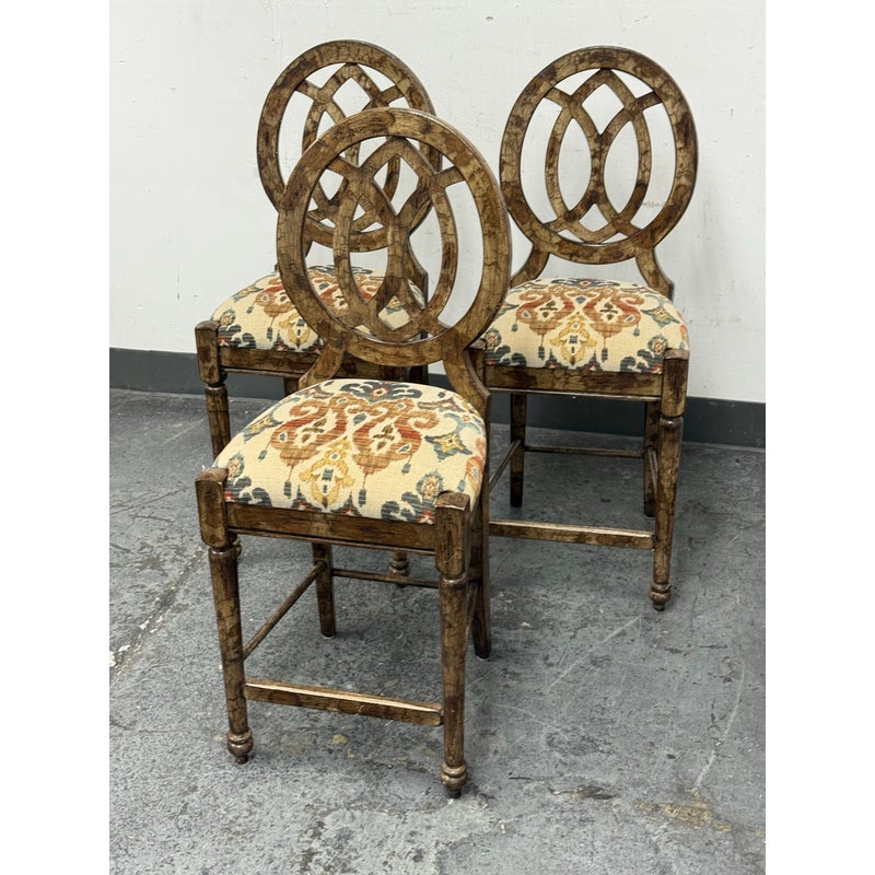 Design Plus Gallery presents a Set of Custom Three Counter Stools. Deeply cushioned seats are upholstered in a neutral tone Ikat motif, and framed with oval shaped backs. The tone of texturized faux marble embellishes the wood frame. Visible wear to the finish is present and considered consistent with usage. Made in the USA.