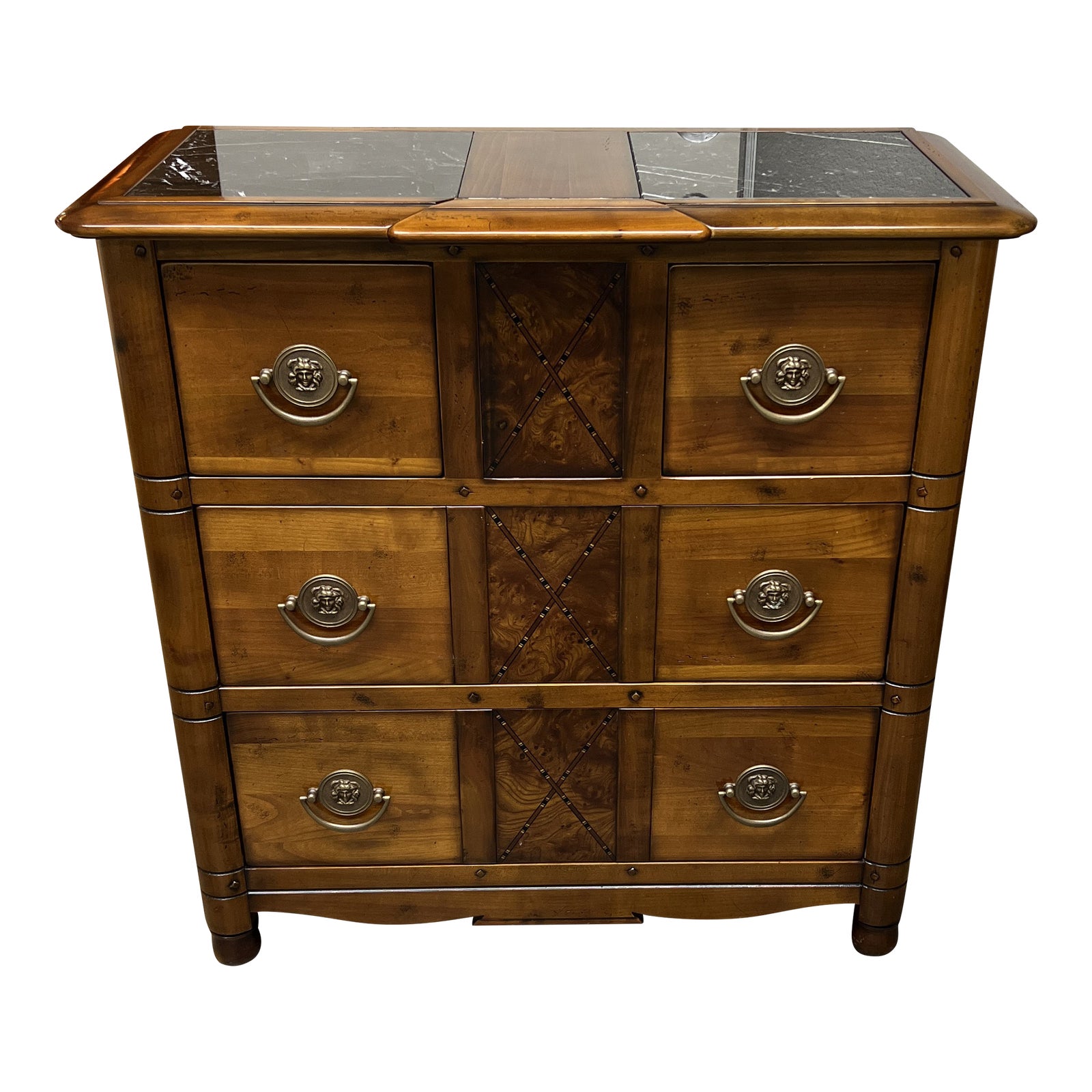 Design Plus Gallery presents the Custom Design Marble Top Wood Buffet. Two small drawers are at the top, with two full-size drawers on the middle and bottom. A center top piece comes out for a hidden compartment. The drawers’ metal hardware feature feminine face accents. Minor wear from age and usage; buffet is in good condition. Made in France.