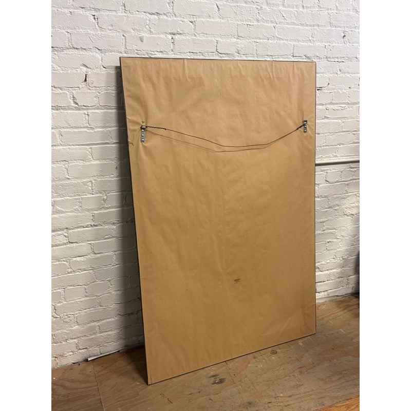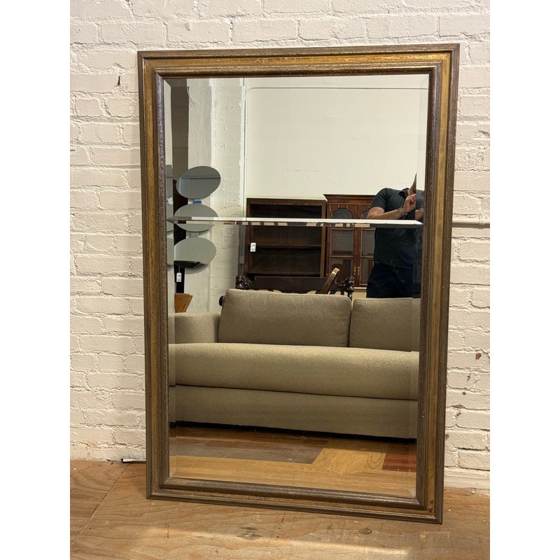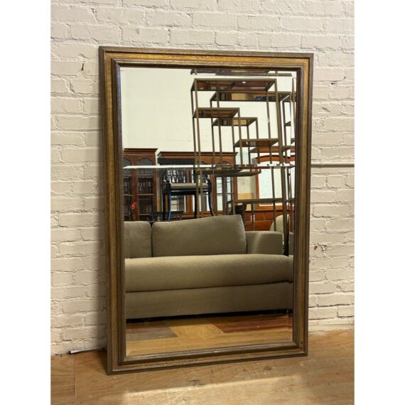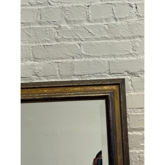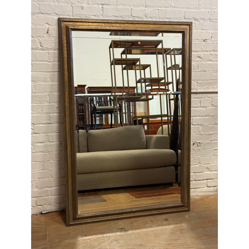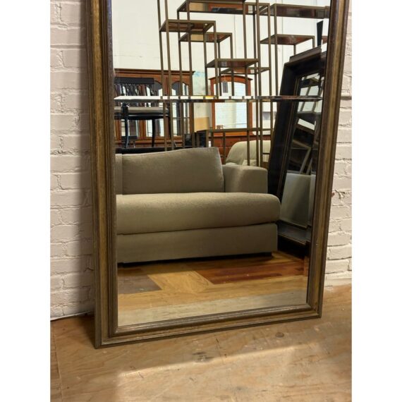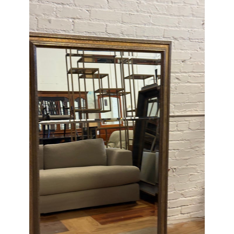 Design Plus Gallery presents a Custom Full Length Mirror. A rectangular silhouette, an antiqued gilt-toned frame, and a beveled mirrored surface. A horizontal mirrored band across the center introduces added dimension to the overall profile, while the layered molding gives the frame depth and definition. The piece has a classic look with subtle tonal variation throughout the frame and a substantial visual presence. Is in good condition with visible and minimal wear from usage.