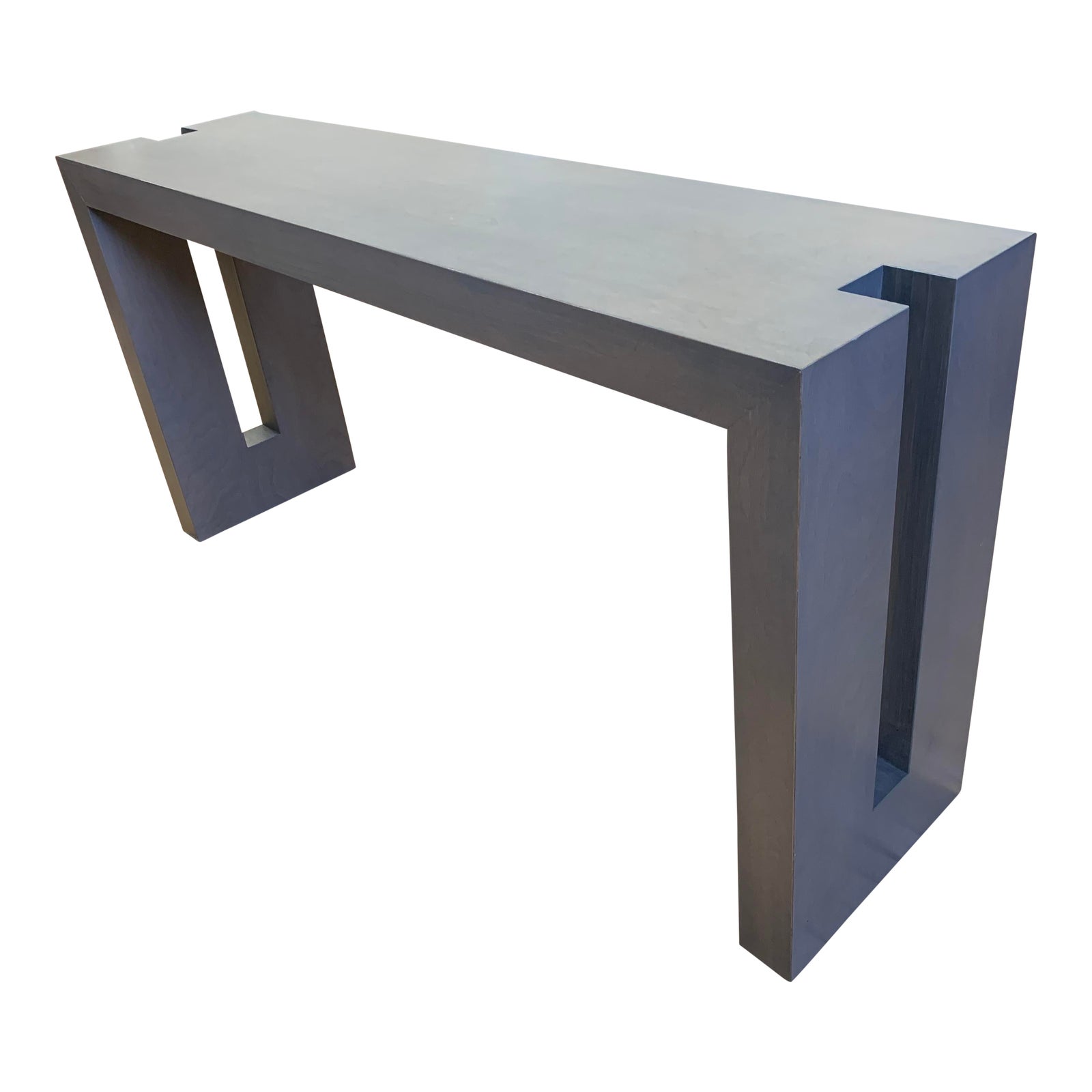 Design Plus Gallery presents a Custom Geometric Frame Wood Console Table. A gray wash stain is applied to oak veneer to form a taupe finish. Sleek cutouts to sides create a lightness to the thick wood surfacing. Visible wear on the surfaces. Console is perfectly symmetrical.