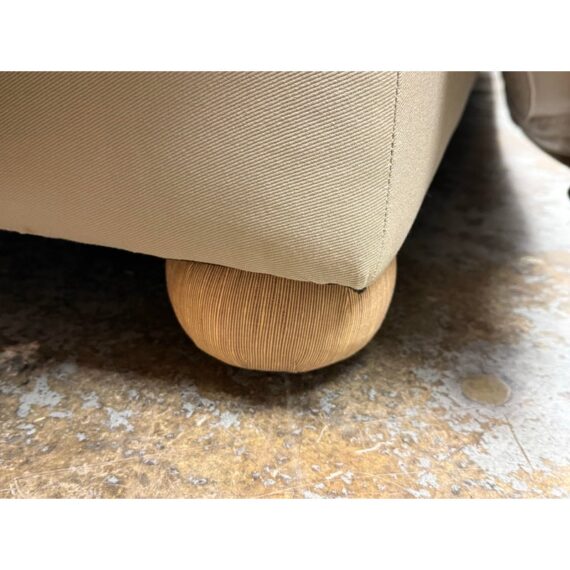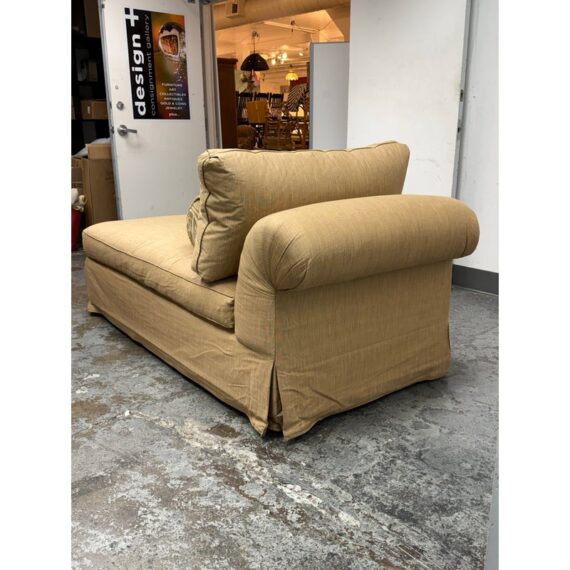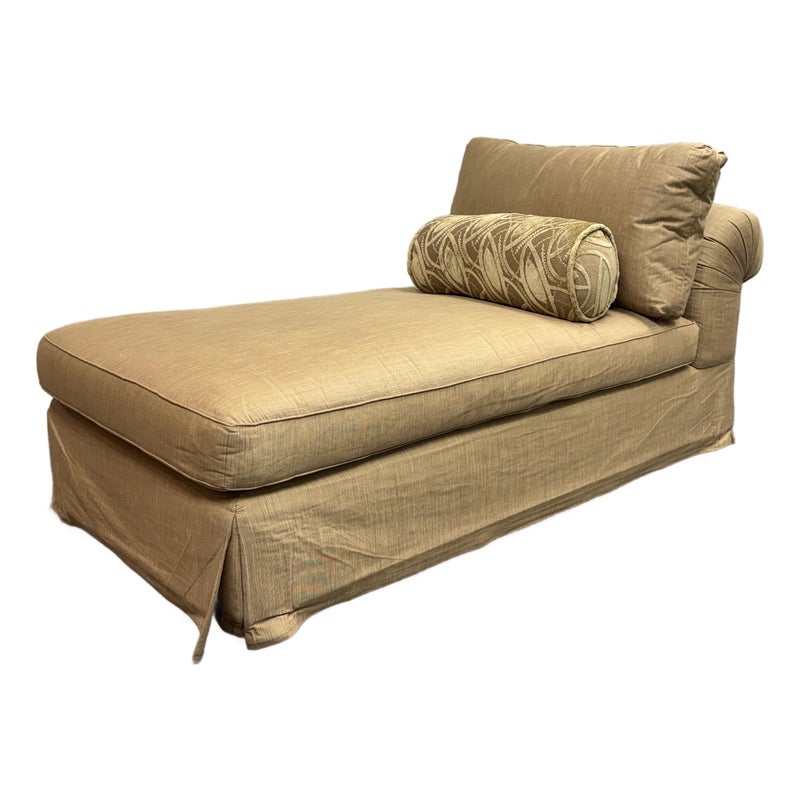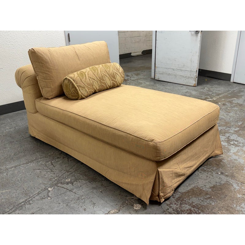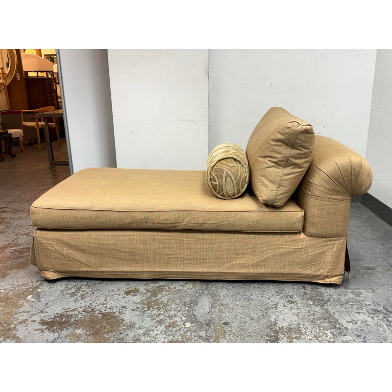 Design Plus Gallery presents a Golden Silk Chaise Lounge and Lumbar Pillow of Custom Design. A wonderful seat to relax in your home in any room with the space to hold such a regal piece. The fabric has a silky sheen and comes is somewhat iridescent with shimmering effect as the color seems to change depending on the angle it’s viewed from. It has a rolled back to soften its profile with a nice pleat work to show its fine craftsmanship. A single back pillow of the same material and a lumbar pillow in complimentary floral print come with the chaise. There are visible signs of wear to the material but overall it is in good condition for its usage. Made in USA.