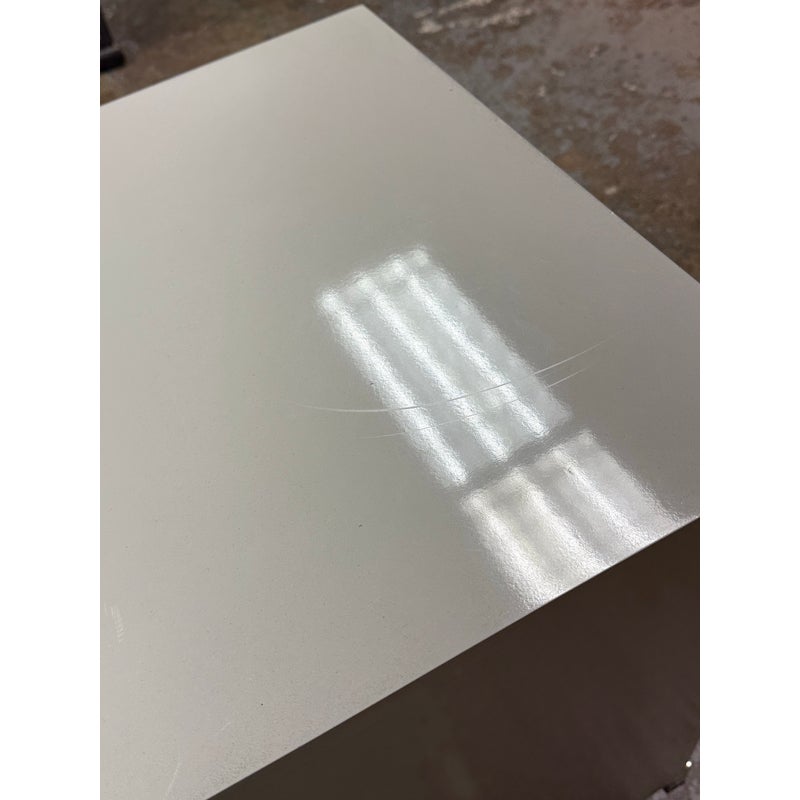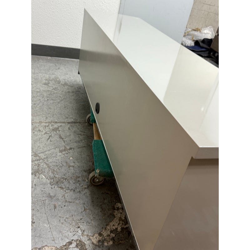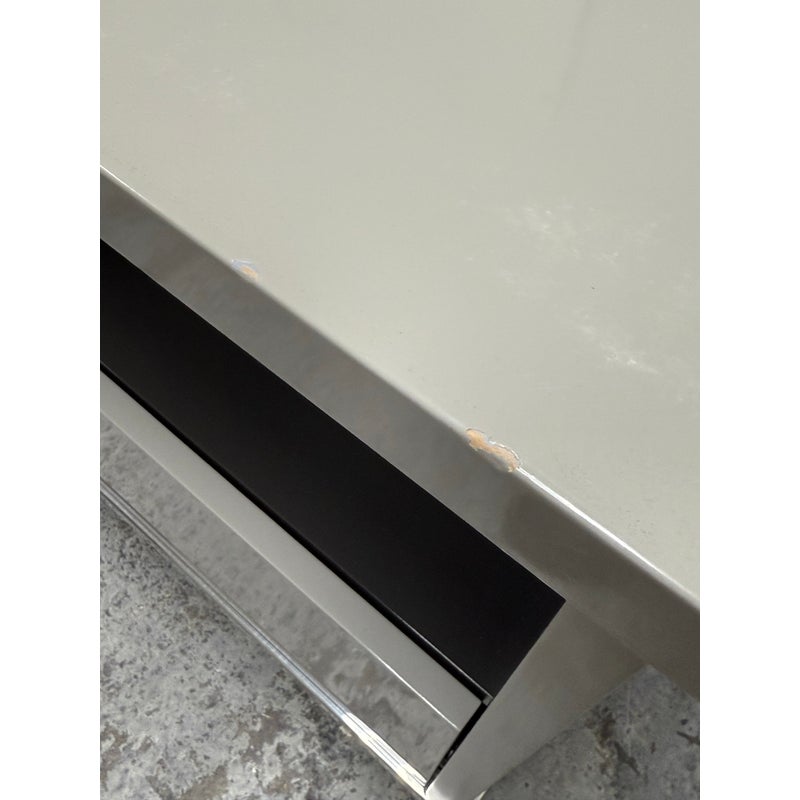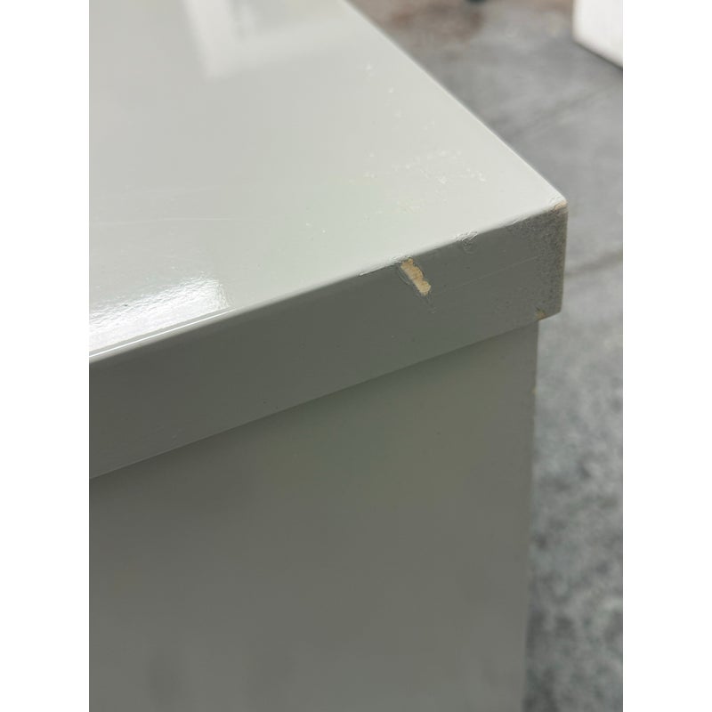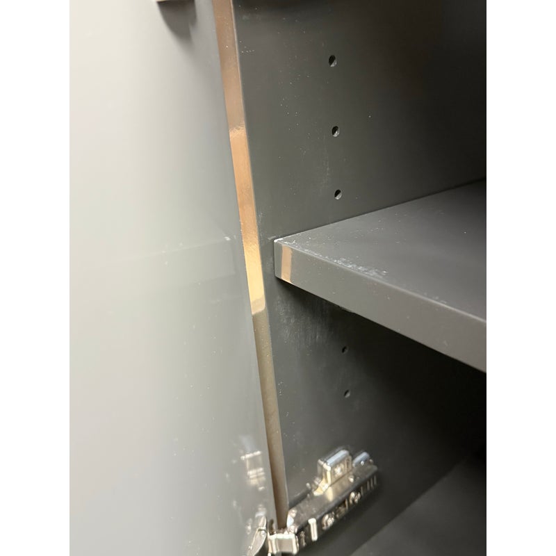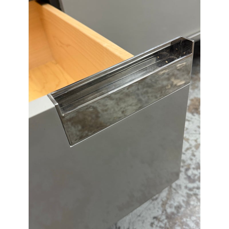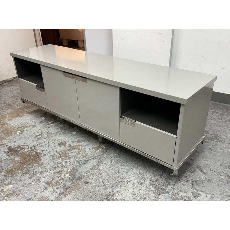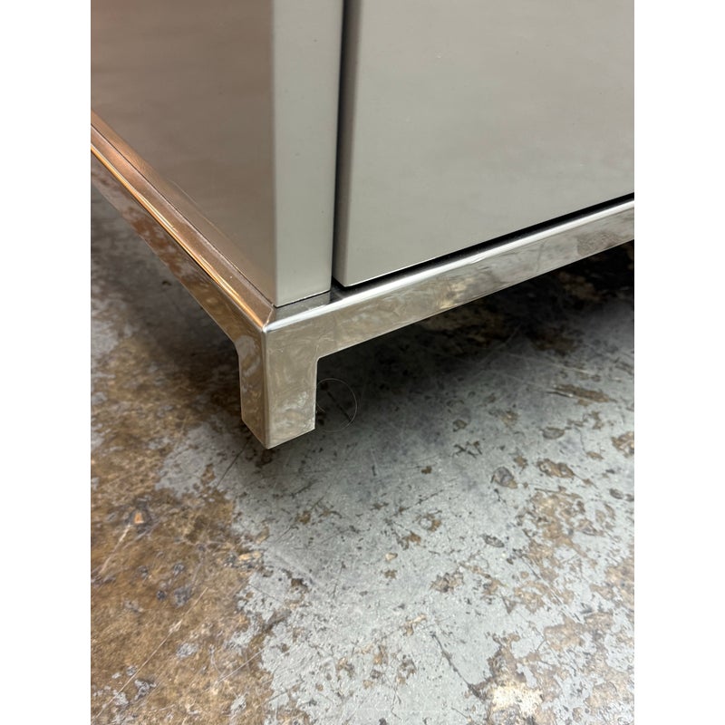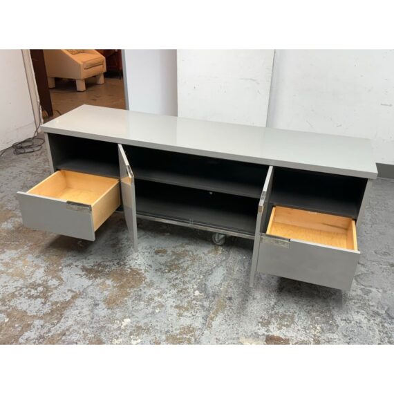 Design Plus Gallery presents a Gray Lacquer Media Cabinet of Custom Design. The custom piece is chic and unique, perfect for the modern home/apartment. The center has two cabinet doors that open to an inner shelf. Each side of the cabinet offers a lower drawer with open cavity space above. Shiny chrome frame and hardware for a seamless presentation. Visible wear is present with some paint chips and scratching but overall in good condition for its usage.
