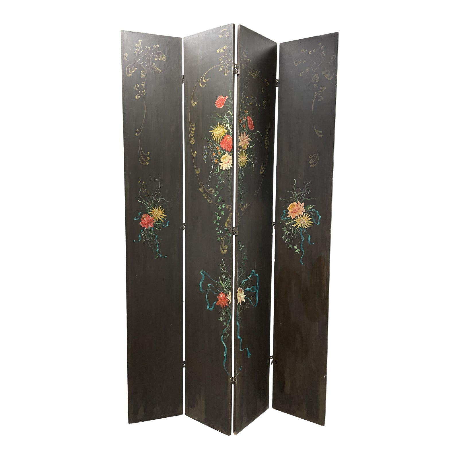 Design Plus Gallery presents a Custom Design Hand Painted Four Panel Screen. Tall panels are hand painted on both sides. Front face has an array of vibrant florals and blue ribbon. Blue ribbon extends and wraps around the back. Some of the hinges shows wear and could use re-working. Screen is in good condition.