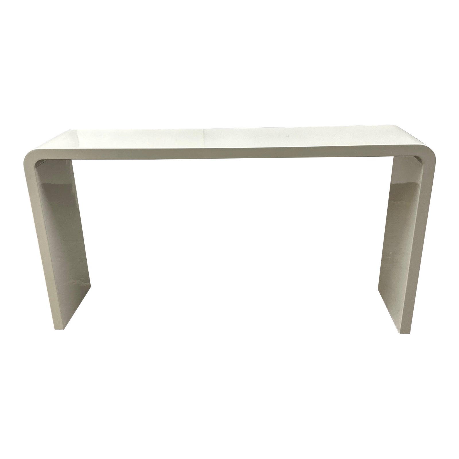 Design Plus Gallery presents a White Waterfall Console. Although unbranded this is a nice, lightweight piece that will look great in a new modern home due to its simple lines and bright white lacquer paint. Is in good condition with minimal signs of wear/tear.