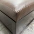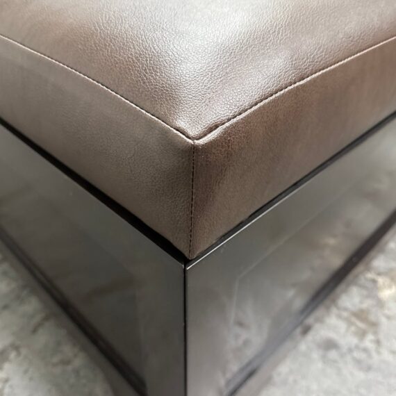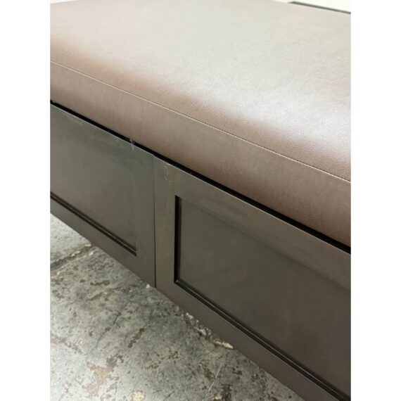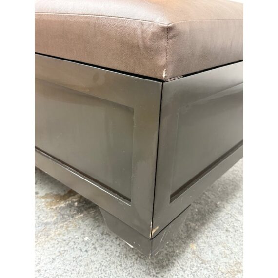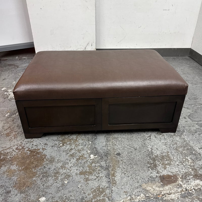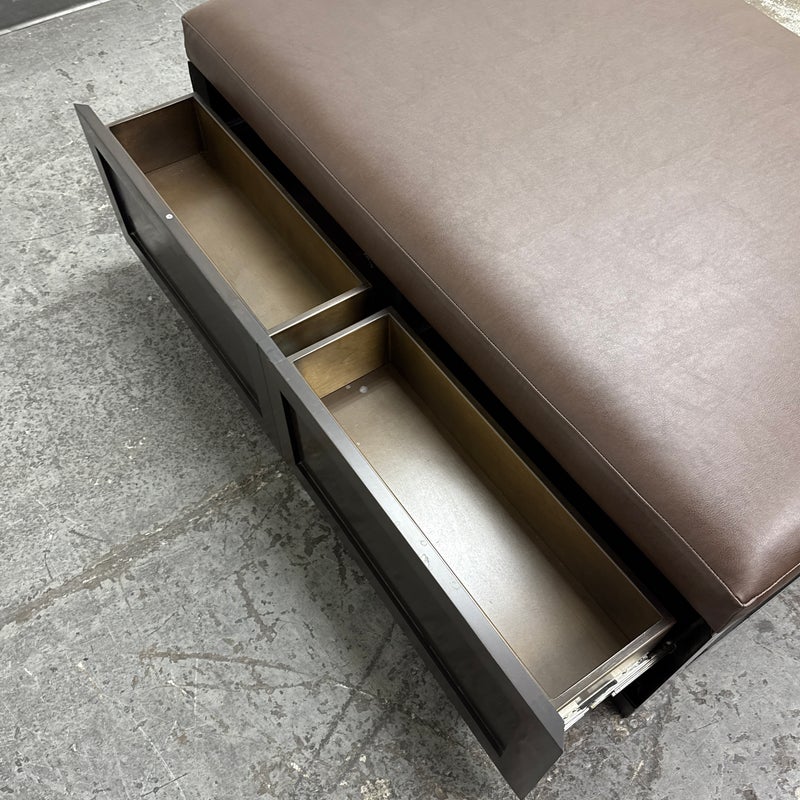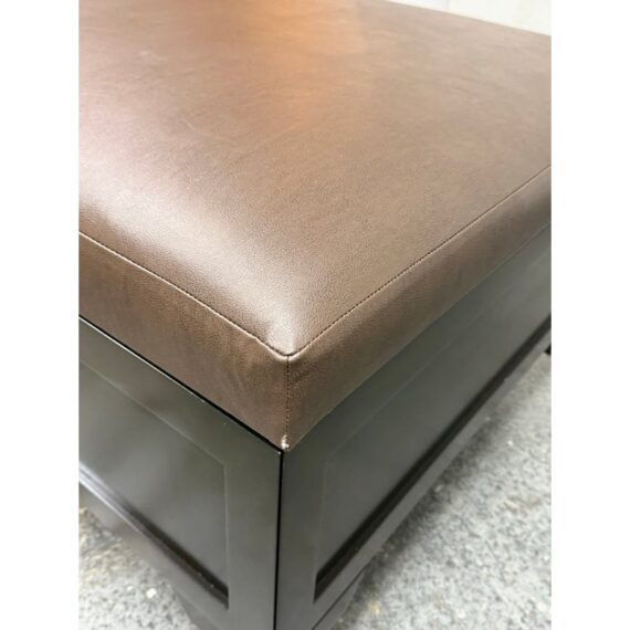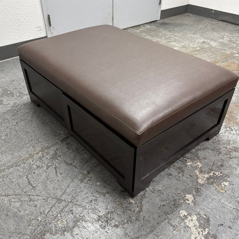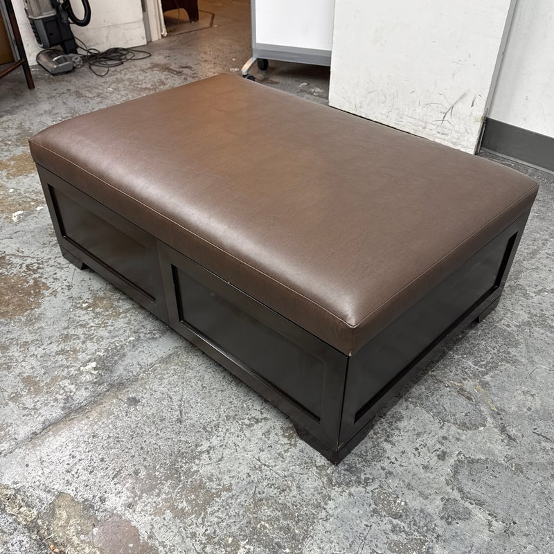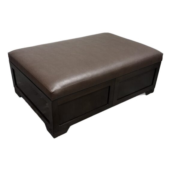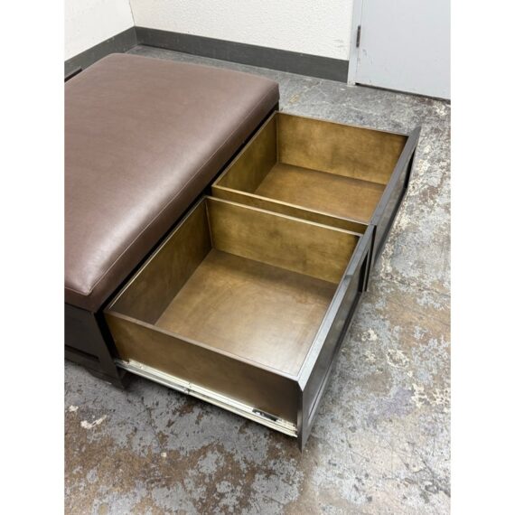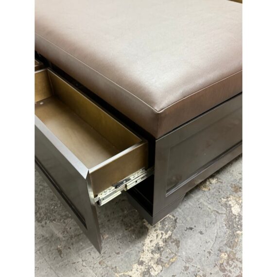 Design Plus Gallery presents a Custom Design Dark Brown Leather Topped Storage Ottoman. The plush table top has a thick graded brownish/black leather that is great for seating or for putting your feet on. With an additional of tray table this could be a wonderful cocktail table due to the plush filling. The coup d’resistance is the very much hidden storage drawers that are concealed with enviable panels work. The ottoman is in good condition, visible wear on leather + wood, scratches and chips. Made in USA.