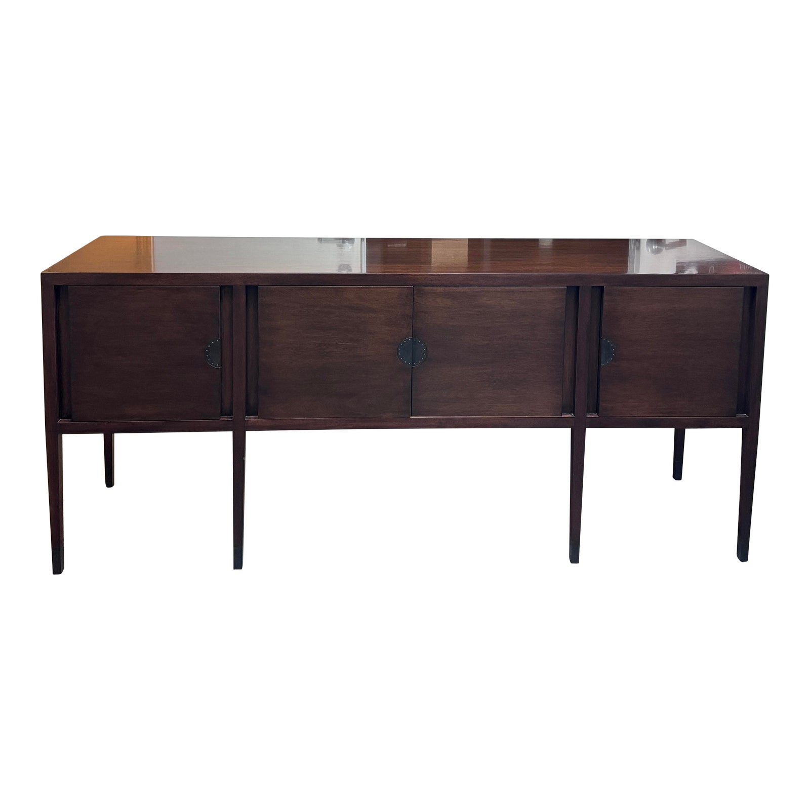 Design Plus Gallery presents a Custom Design Buffet with Bronze Accents. This sideboard is customized and of solid hardwood mahogany. The buffet has four doors, two in the center that oppose each other and swing open two reveal two half width pull out shelves. The two doors on either side also have two quarter width pull out shelves. The brass plates have a nice half moon design to open and protect wear in the long run for the wood. Is in good condition for its age + use.