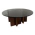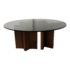 Design Plus Gallery presents a Walnut Pedestal Glass Topped Coffee Table in the Mid 20th Century Style. The walnut slabs are crossed in multiple ways to make a geometric form that consists of its pedestal base. The circular smoked glass top is thick with a rounded edge. There are a few surface conditions on the glass and wood but overall in good condition.