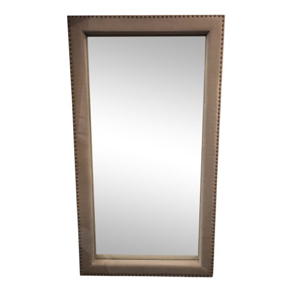 Design Plus Gallery presents a New Custom Design Linen Full Length Mirror. The large mirror is padded and then upholstered in a neutral gray linen, accentuated with antiqued bronze nailhead. Designed to stand or hang vertically, there is a metal cleat on the back for hanging. l