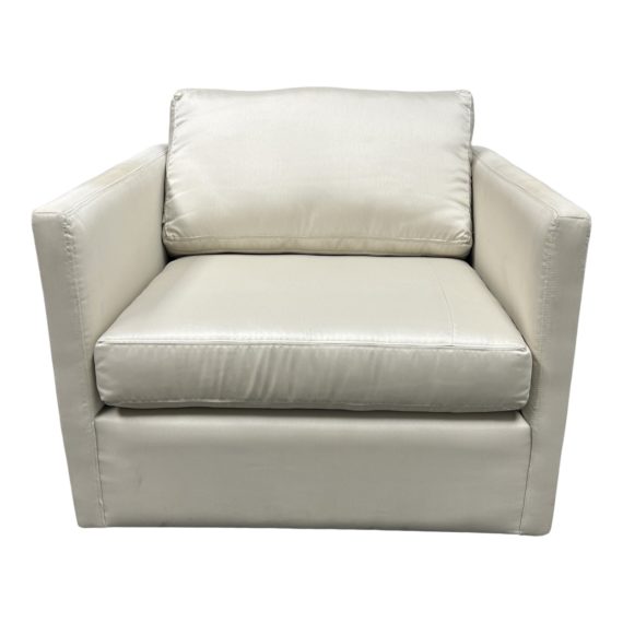 Design Plus Gallery presents a Custom Design Pfister Style Off White Silk Pinstripe Lounge Chair. It has a modern design with thin arm rests.Visible and minor wear.