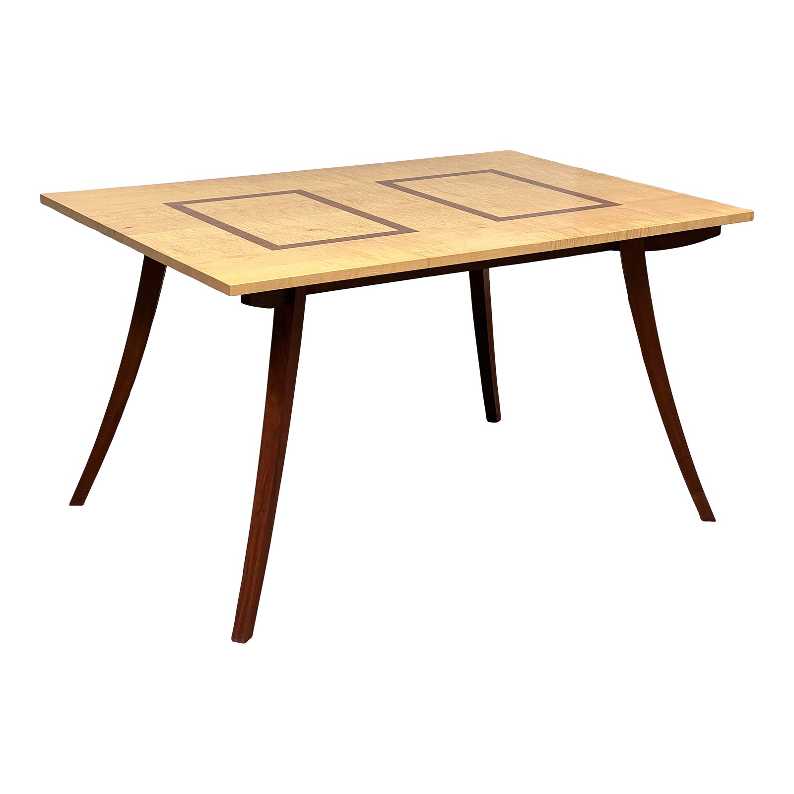 Design Plus Gallery presents a Custom Design Maple + Walnut Artisanal Dining Room Table by Priscilla Cypiot. The elegantly sloped, turned out legs of solid walnut wood match the rectangular inlay within the Maple Table Top. The grain of Maple is a standout to this tabletop as well. Good condition, with little wear considering age and usage.