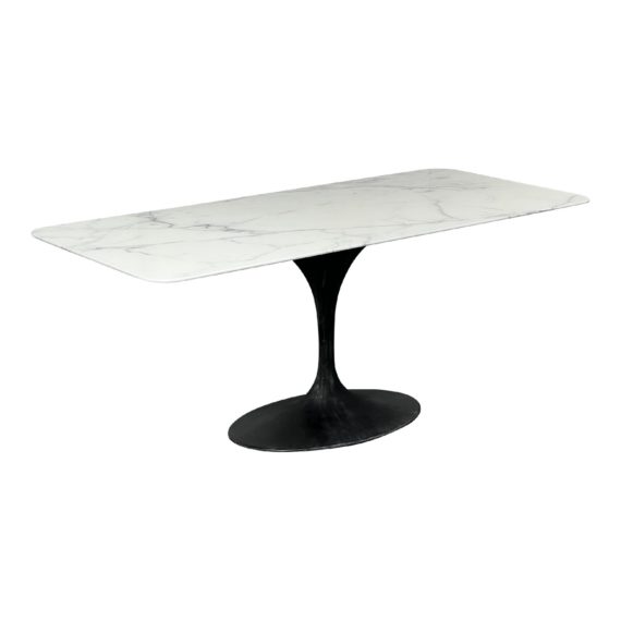 Design Plus Gallery presents a Custom Saarinen Style Table. Produced by Wick Designs in California, USA. A modern and industrial touch. The beveled white marble top adds a touch of elegance and sophistication to the overall design. The distressed black finish on the metal tulip table base adds a vintage and rustic feel to the piece, making it perfect for both contemporary and traditional dining spaces. With its versatile design, this dining table can accommodate a variety of seating arrangements and can easily seat six people. Whether used for family dinners, entertaining guests, or even as a stylish workspace, this custom rectangular dining table is a statement piece that will enhance any interior design. Its mid-century inspired design and combination of white marble and distressed black metal make it a unique and eye-catching addition to any dining room or kitchen. Visible and minor wear from usage.