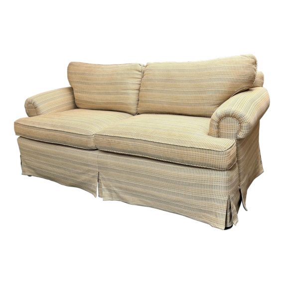Design Plus Gallery presents a Custom Design Rolled Arm Loveseat. This custom loveseat is the perfect blend of comfort and style. With two loose back cushions over two plush seat cushions, this loveseat offers a cozy place to relax. The rolled arms and skirted frame add a touch of elegance to the design. Upholstered in a textured woven fabric that features a mix of blues, tans, browns, blacks, and whites. This subtle yet sophisticated color palette adds depth and visual interest to the piece. Short tapered dark finish legs provide a sturdy base for the loveseat while adding a modern touch to the overall look. The cushions are filled with feather down inserts, ensuring a luxurious seating experience. One cushion does not have any protective feather insert. Whether used in a living room, bedroom, or cozy reading nook, this custom loveseat is sure to become a favorite spot for relaxing and unwinding. In good condition, visible markings and wear from usage + age.