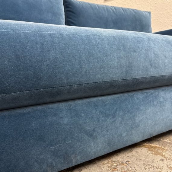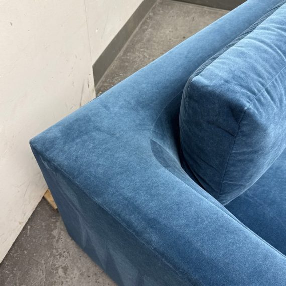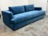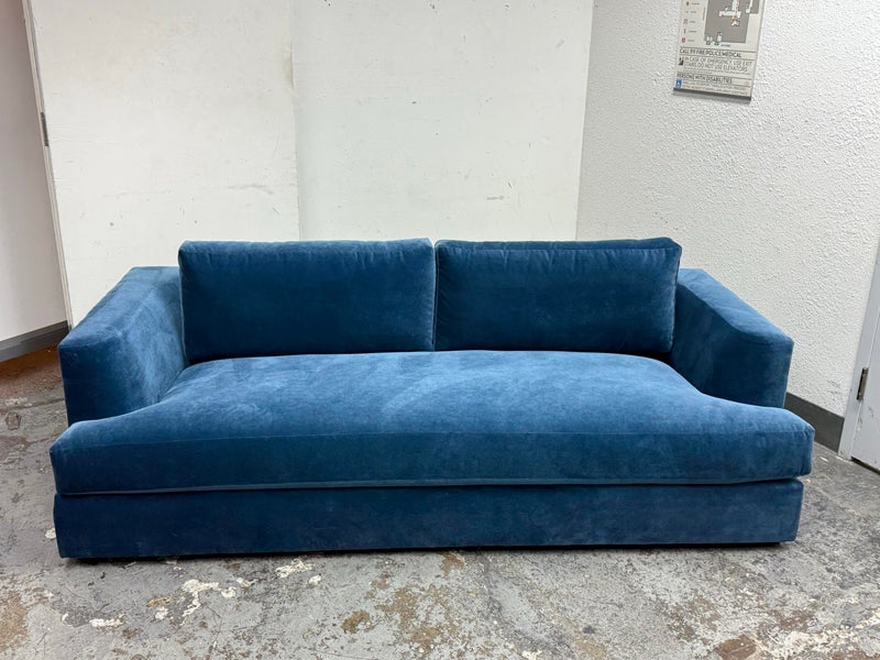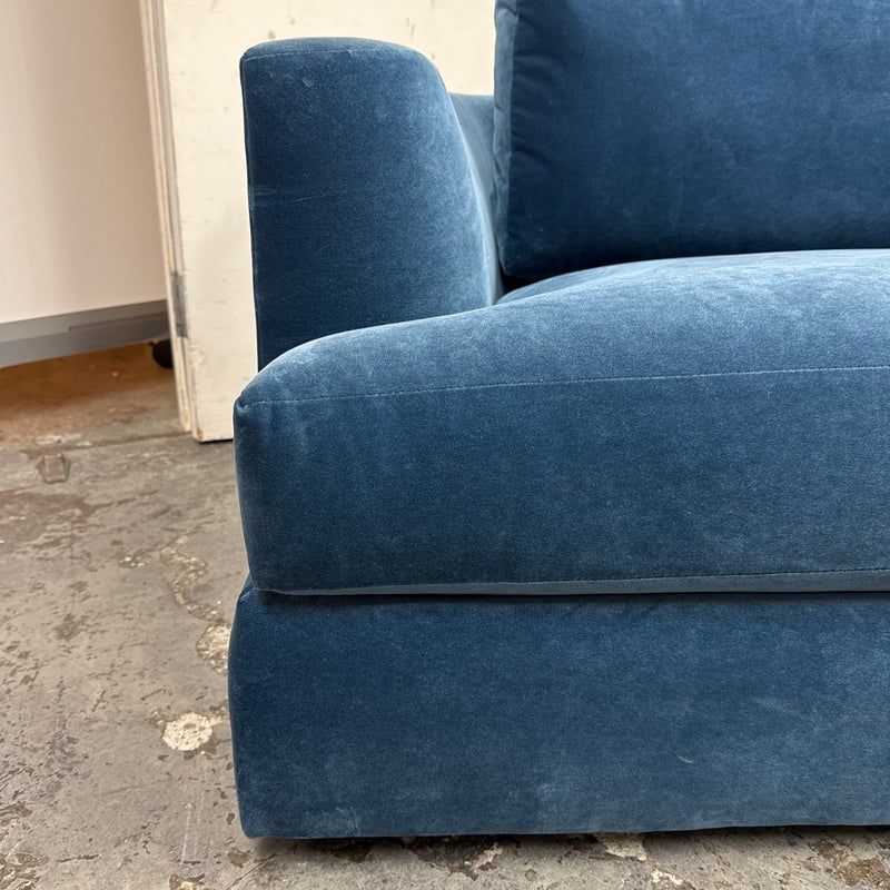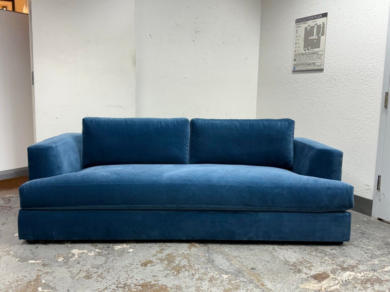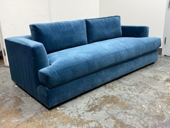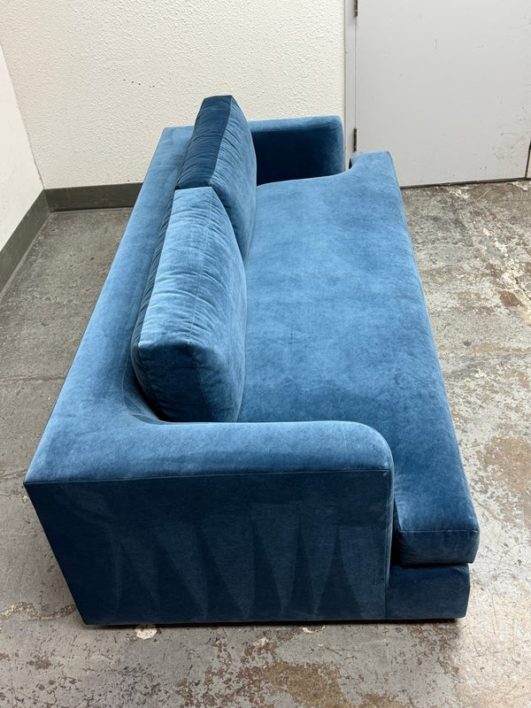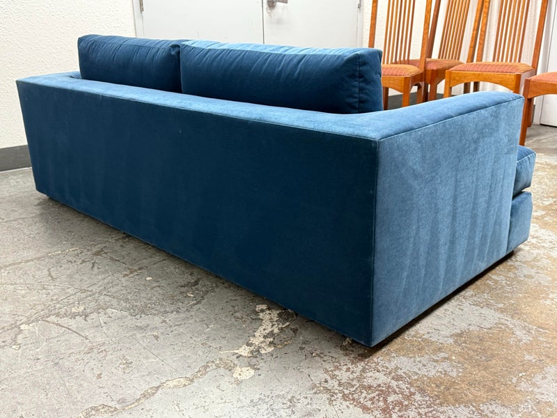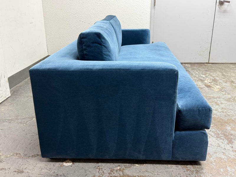 Design Plus Gallery presents a Performance Velvet Sapphire Blue Sofa of Customization. Behold the bold proportions and a low-lying silhouette make a contemporary statement but with a blast of splashy color. Its generous arms and deep seat envelop the body, while impeccable premium performance velvet upholstery to offer a sleek finish. Is in good condition with minor wear due to minimal usage. Made in North Carolina, USA.