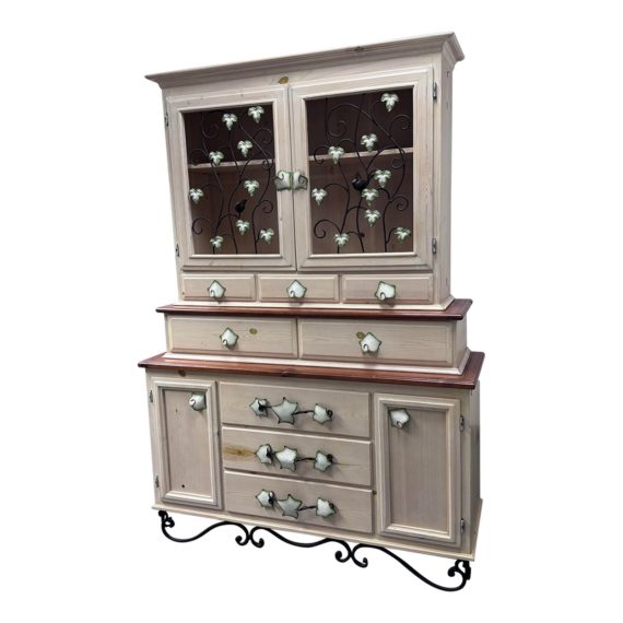 Design Plus Gallery presents a Custom Shabby Chic Kitchen Hutch. This custom creation is covered with an ornate rod iron, which incorporates birds and colored leaves. Excluding the top row of interior drawers, all the drawers are on metal glide systems. The hutch is relatively light weight and made of pine, painted with a whitewash, cream tone. It is accented with a true maple stain, and includes adjustable shelving on the left and right cabinet. There is minor wear; the hutch is in good condition. There is a small crack on the crown. The middle-left drawer is a little faulty. Whether next to windows or walls, this hutch will feel like nature resides in your home! Minor wear from usage + age.
