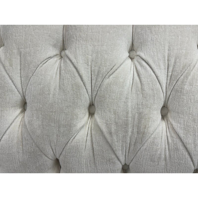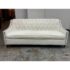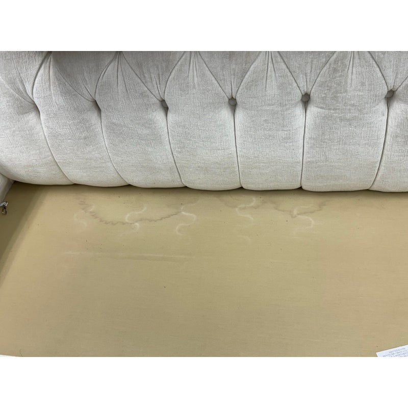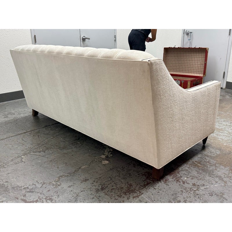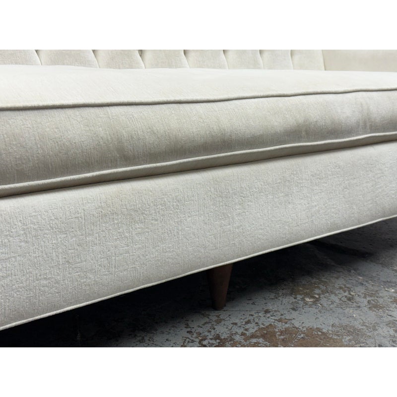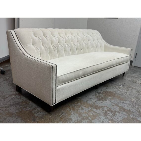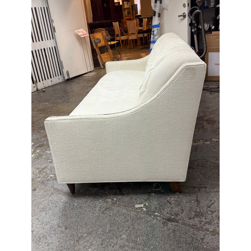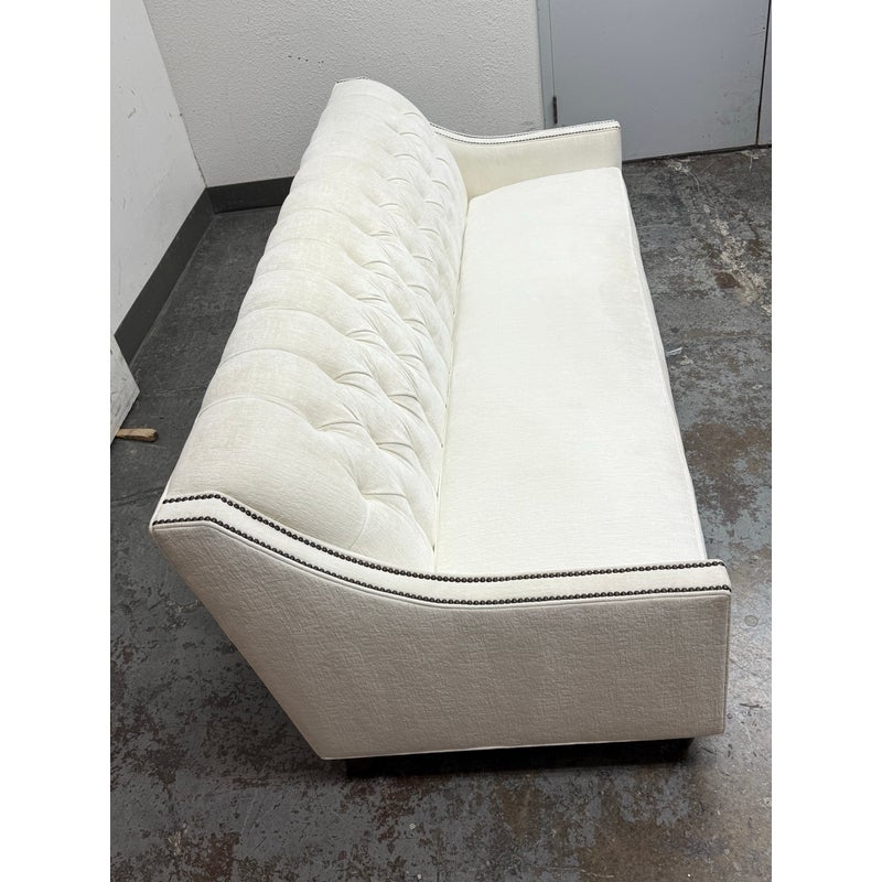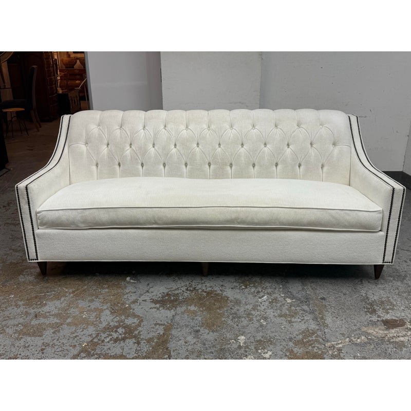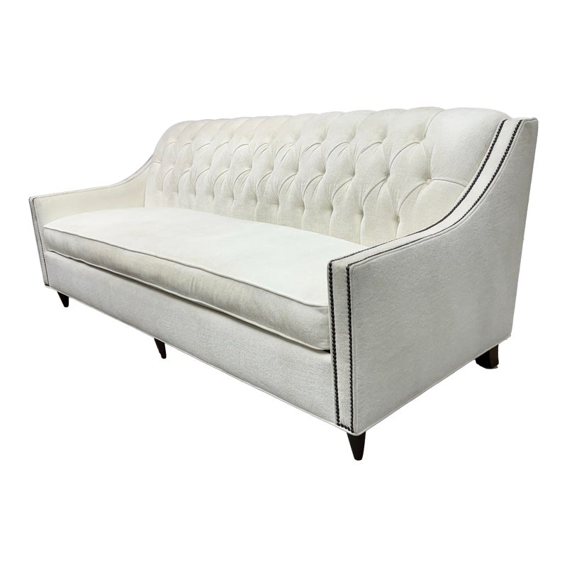 Design Plus Gallery presents a Soft White Velvet Sofa of Custom Make. The sofa has the appearance of refined luxury with contemporary appeal. The sofa has a deeply tufted back seat that is cushion and fixed with just enough back tilt to keep you there comfortably for extended periods of time. The arms are sloped with a recess from the seat cushion to the arm being ever so slight and is trimmed with nailhead to provide the edges with longevity from use. There is a single bench seat cushion with memory foam core and some signs of visible wear to the white color, as expected with use. Overall, it is in good condition for its usage. Made in the USA.