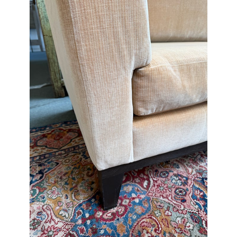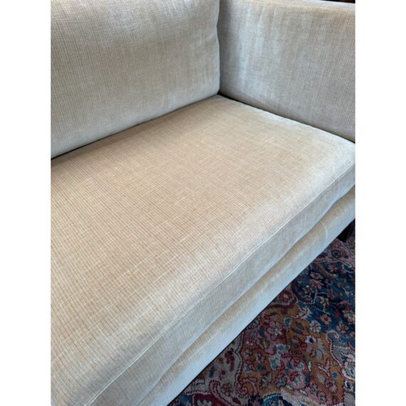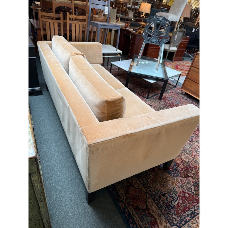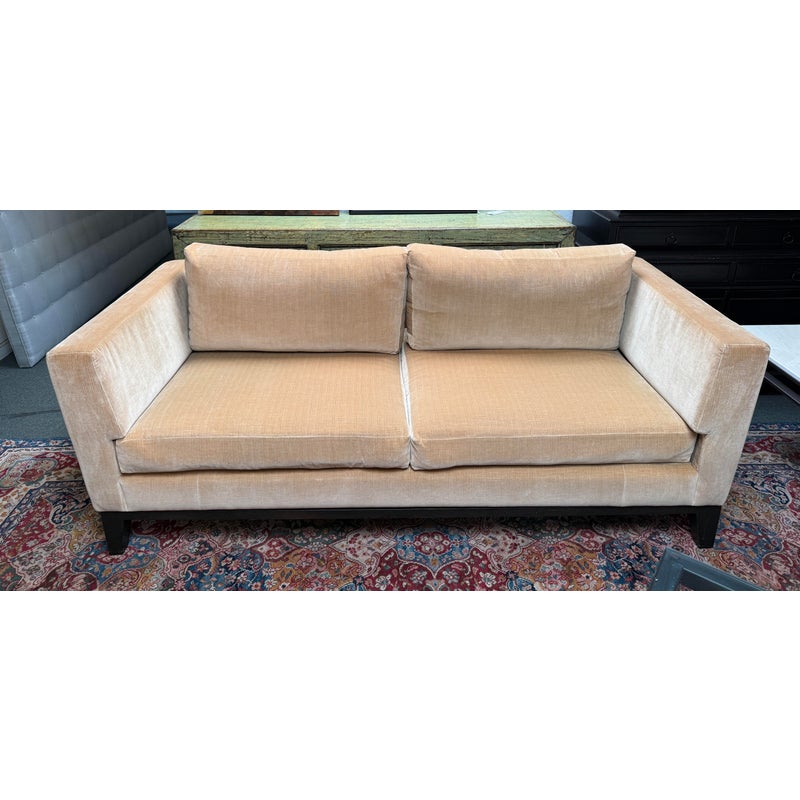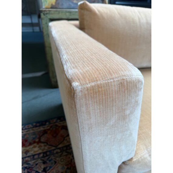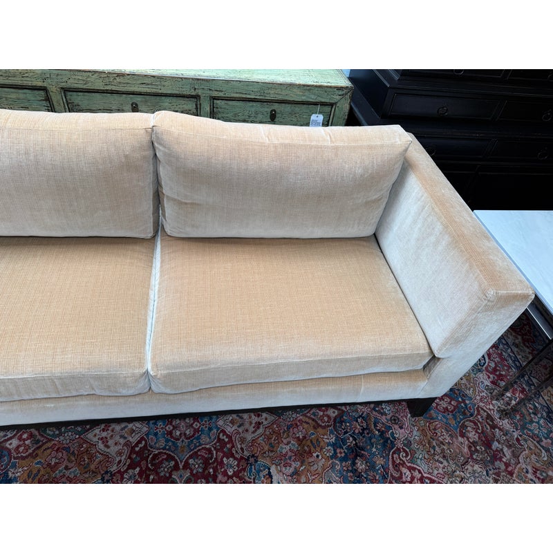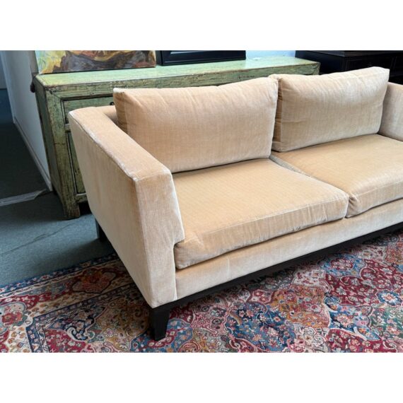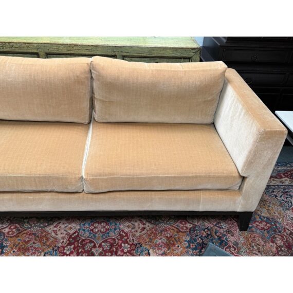 Design Plus Gallery presents a Custom Velvet Sofa. The simple shelter silhouette is echoed in the knife edge loose cushions, down wrapped foam filled. A subtle stripe runs throughout the lush fabric that ends at the dark stained wood base. There is light surface wear with small amount of stains to the fabric that are consistent with its usage.