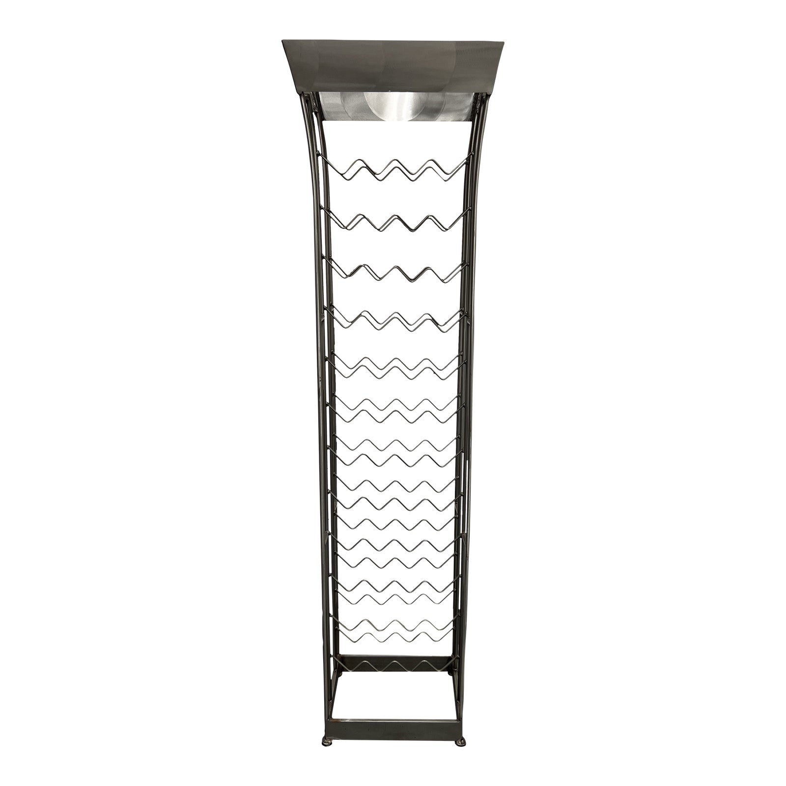 Design Plus Gallery presents a Custom Design Tall Metal Wine Storage Shelf. The base is made with a rectangular metal bar in a chrome finish. Rounded rods aim upwards, making two columns worth of zigzagged racks and topping at a metallic sheet top. Some rust on base. Minor wear consistent with use; storage shelf is in good condition.
