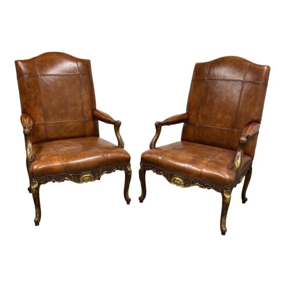 Custom Design Tipped Leather Patchwork + Gold Gilt Bergerre Arm Chairs – a Pair. Original Price: $16,000
