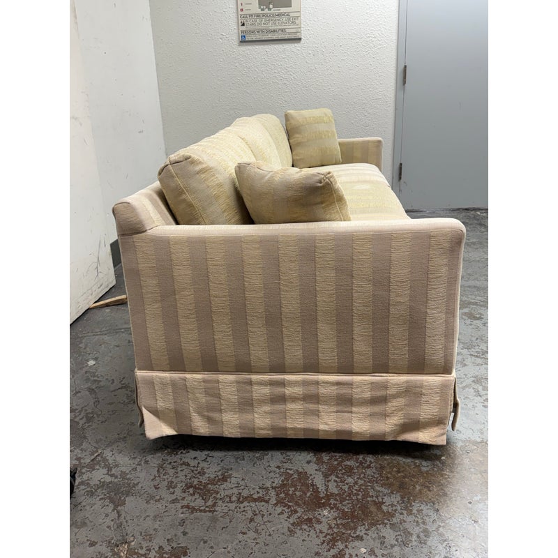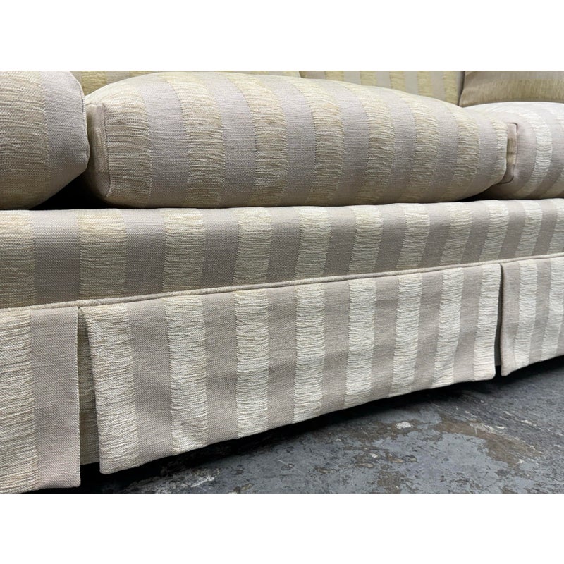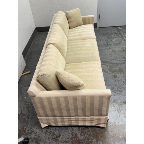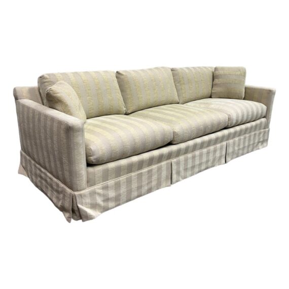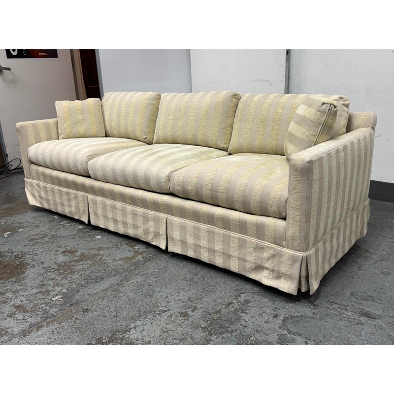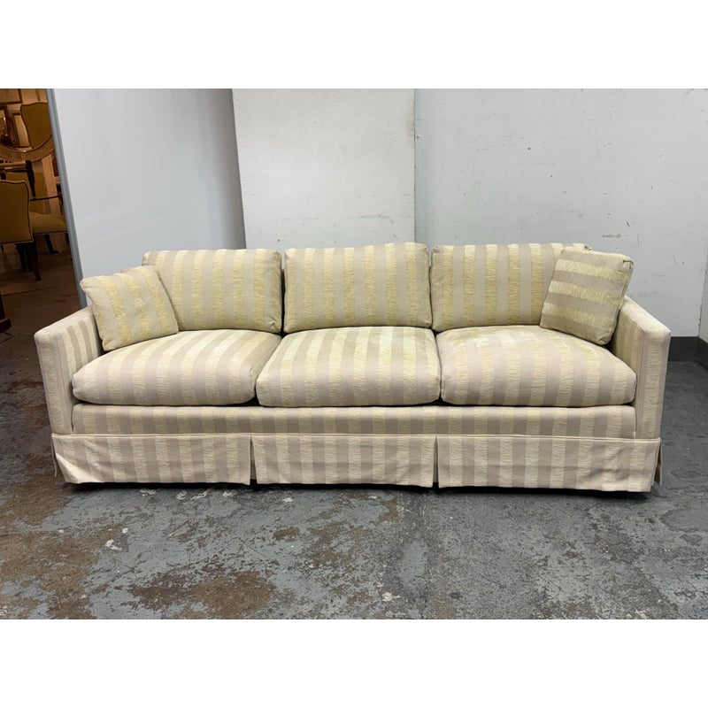 Design Plus Gallery presents Custom Fabricated Silk Shantung Striped Sofa in a Traditional Style. The sofa will blend into any conservative home with great presence and comfort. The easy going piece has neutral striping of off white with a champagne even spaced on the entirety of the sofa and its loose pillows. There are three seat cushions, with three back cushions, two throw pillows and a skirt all matching with the becoming sheen of its stripes. The sofa was refurbished by an upholstery service and their tag, Lindberg Designs is found under the seat cushions. There is surface wear such as sun fade that is consistent with its usage. Made in San Jose, California, USA.