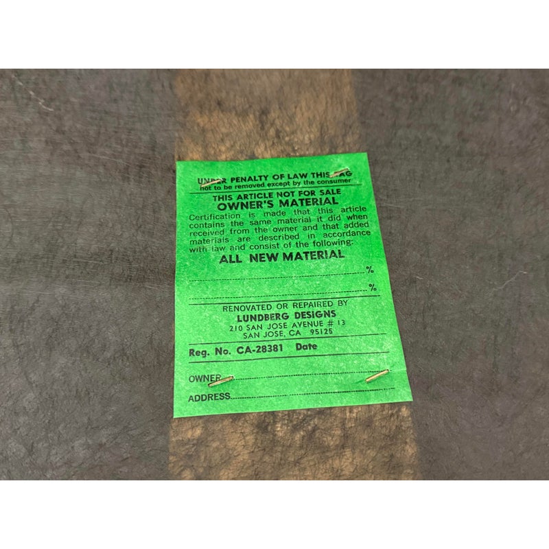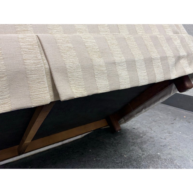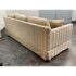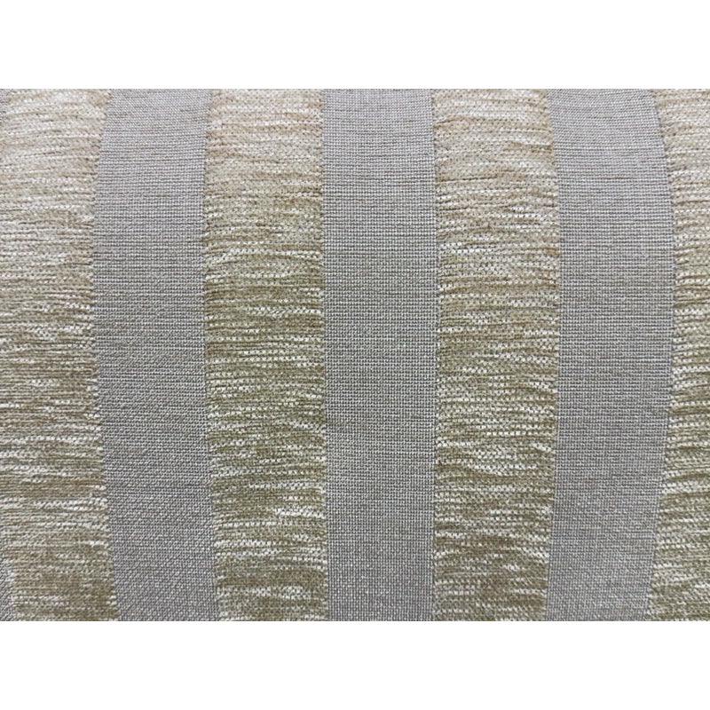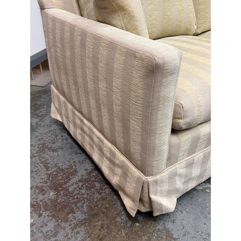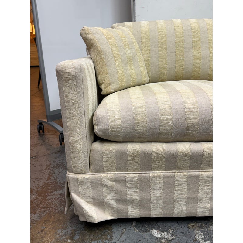 Design Plus Gallery presents Custom Fabricated Silk Shantung Striped Sofa in a Traditional Style. The sofa will blend into any conservative home with great presence and comfort. The easy going piece has neutral striping of off white with a champagne even spaced on the entirety of the sofa and its loose pillows. There are three seat cushions, with three back cushions, two throw pillows and a skirt all matching with the becoming sheen of its stripes. The sofa was refurbished by an upholstery service and their tag, Lindberg Designs is found under the seat cushions. There is surface wear such as sun fade that is consistent with its usage. Made in San Jose, California, USA.