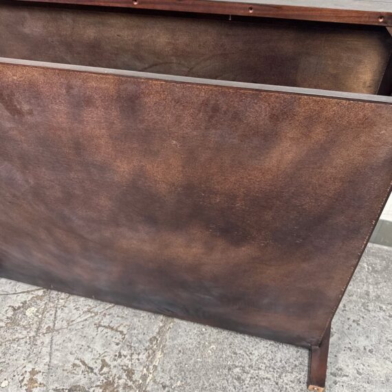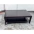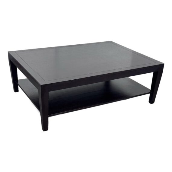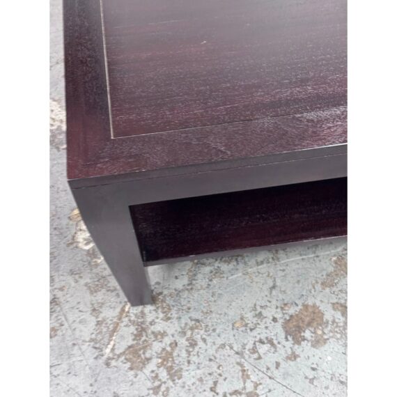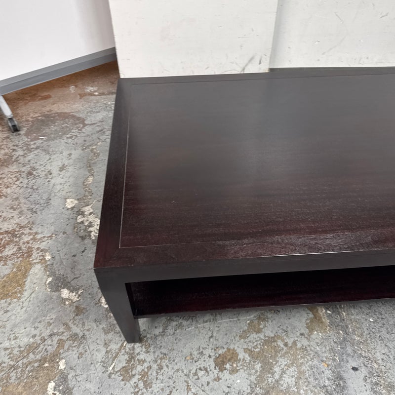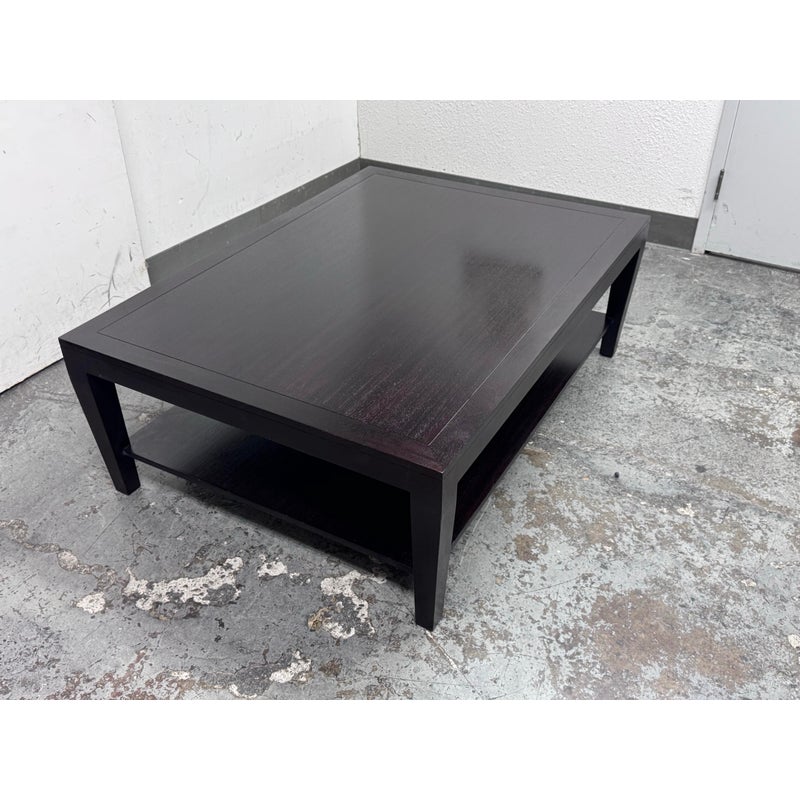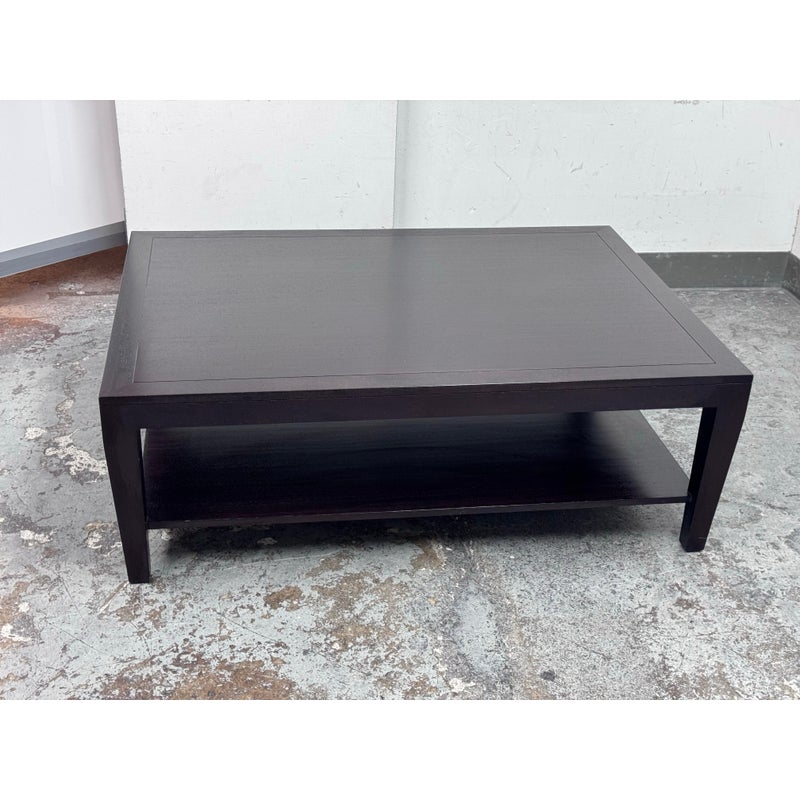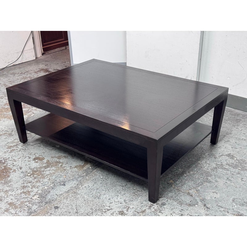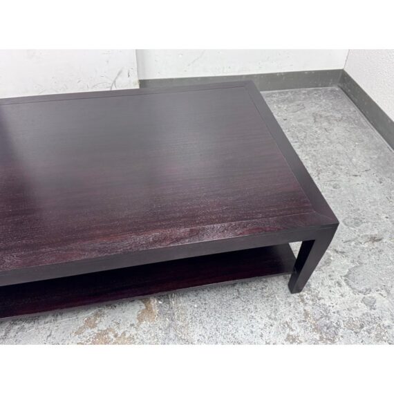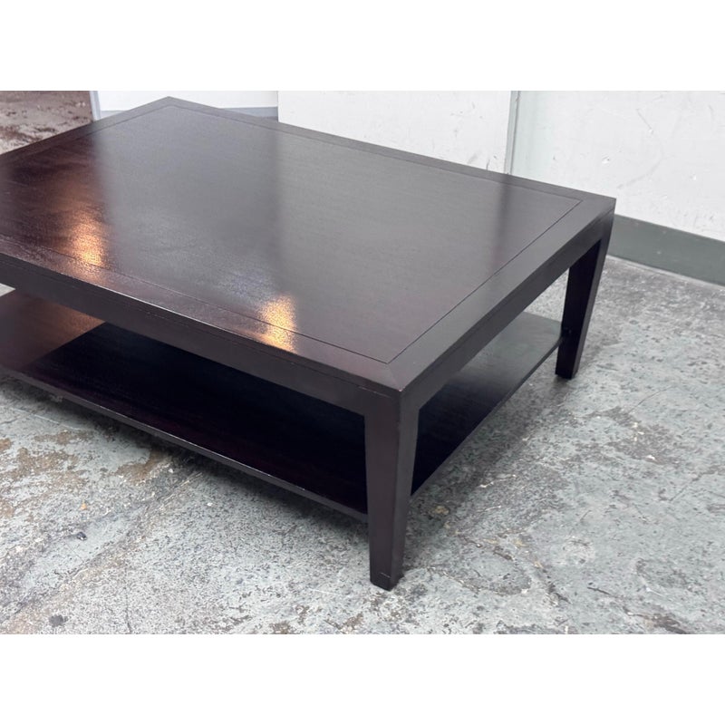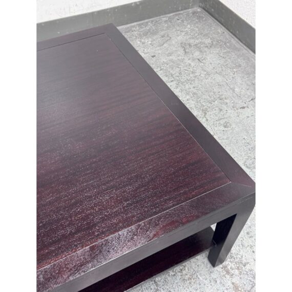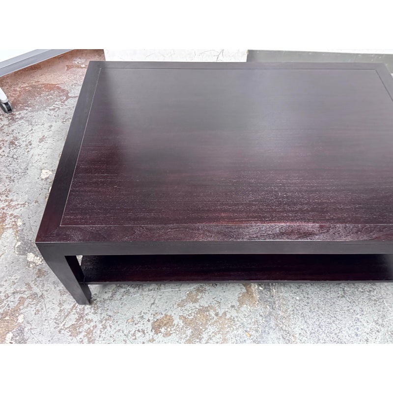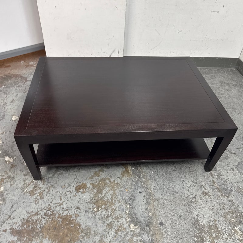 Design Plus Gallery presents a Custom Coffee Table by Unknown Brand. The tables has a rectangular silhouette with a mahogany stain that highlights the natural beauty of the wood grain. Its minimalist design is thoughtfully balanced by a lower open shelf, providing both visual interest and practical storage for books, décor, or everyday essentials. Four subtly tapered legs add an elegant lift, completing a timeless piece that blends seamlessly into modern and transitional living spaces. In good condition, visible and minimal wear from usage.