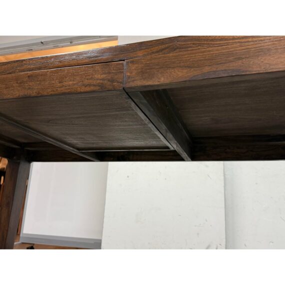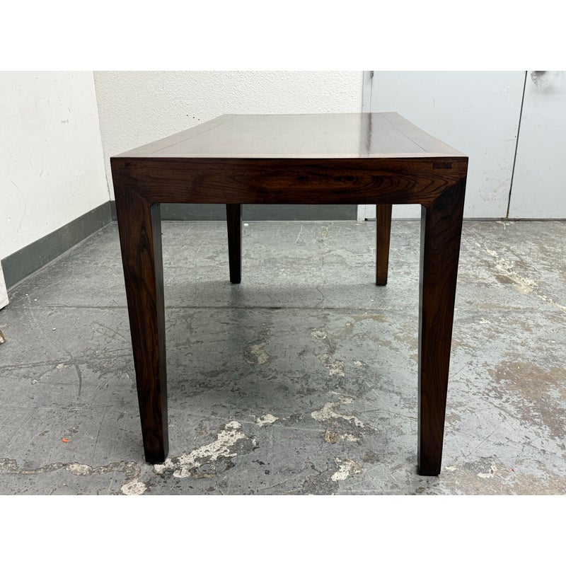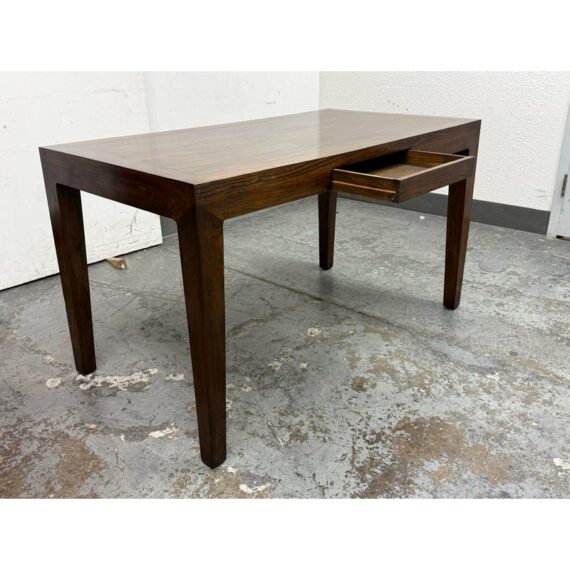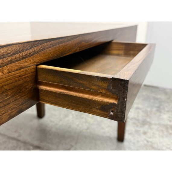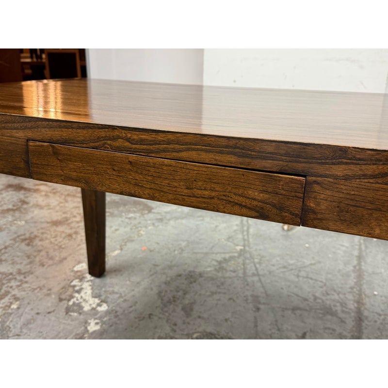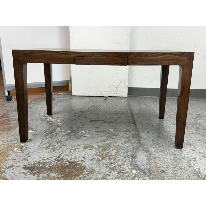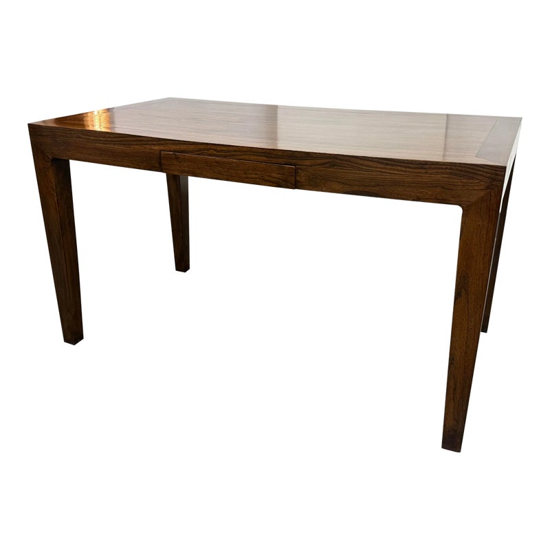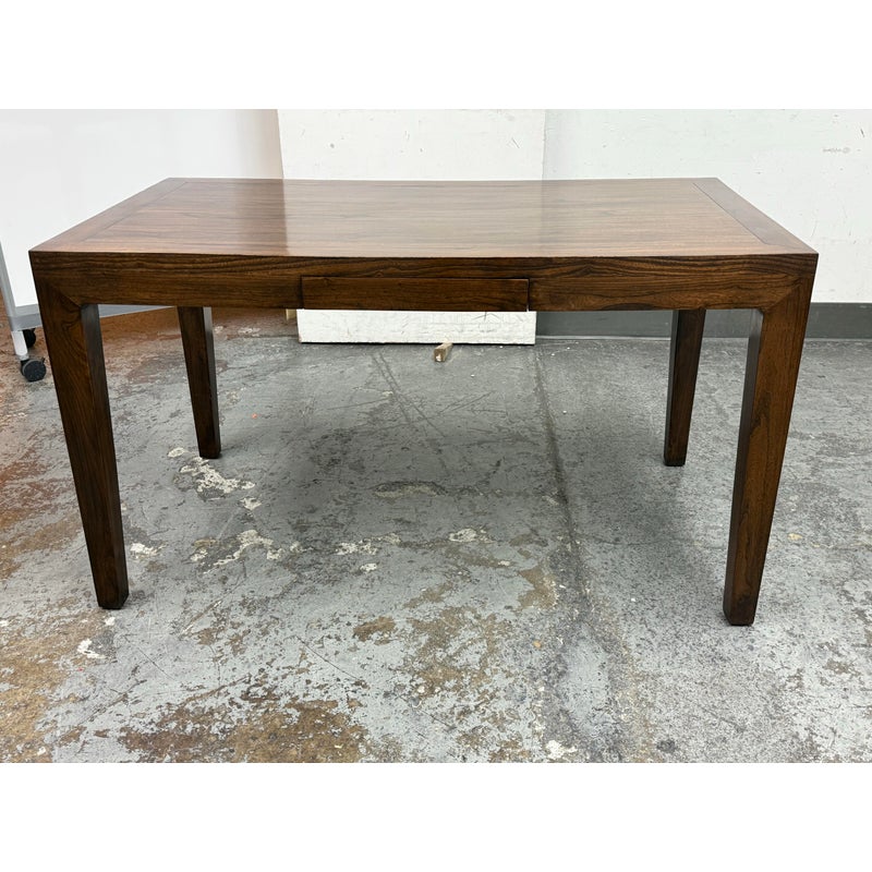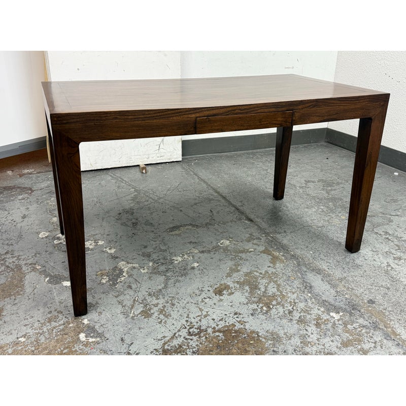 Design Plus Gallery presents a Custom Design Desk. A crafted custom desk, where elegance meets functionality. A rectangular frame constructed from rich, solid walnut wood, showcasing the natural, warm hues and intricate grain patterns. The four tapered legs provide a sleek, modern silhouette, combining stability. At its heart, the desk boasts a single, discreet pullout drawer, seamlessly integrated under the tabletop. This drawer offers a practical storage solution for essentials, maintaining the desk’s clean, uncluttered appearance. Whether for a home office or a stylish workspace, this walnut desk embodies timeless sophistication and expert craftsmanship, serving as both a functional piece and a statement of style. In good condition, visible and minimal wear. Made in USA.