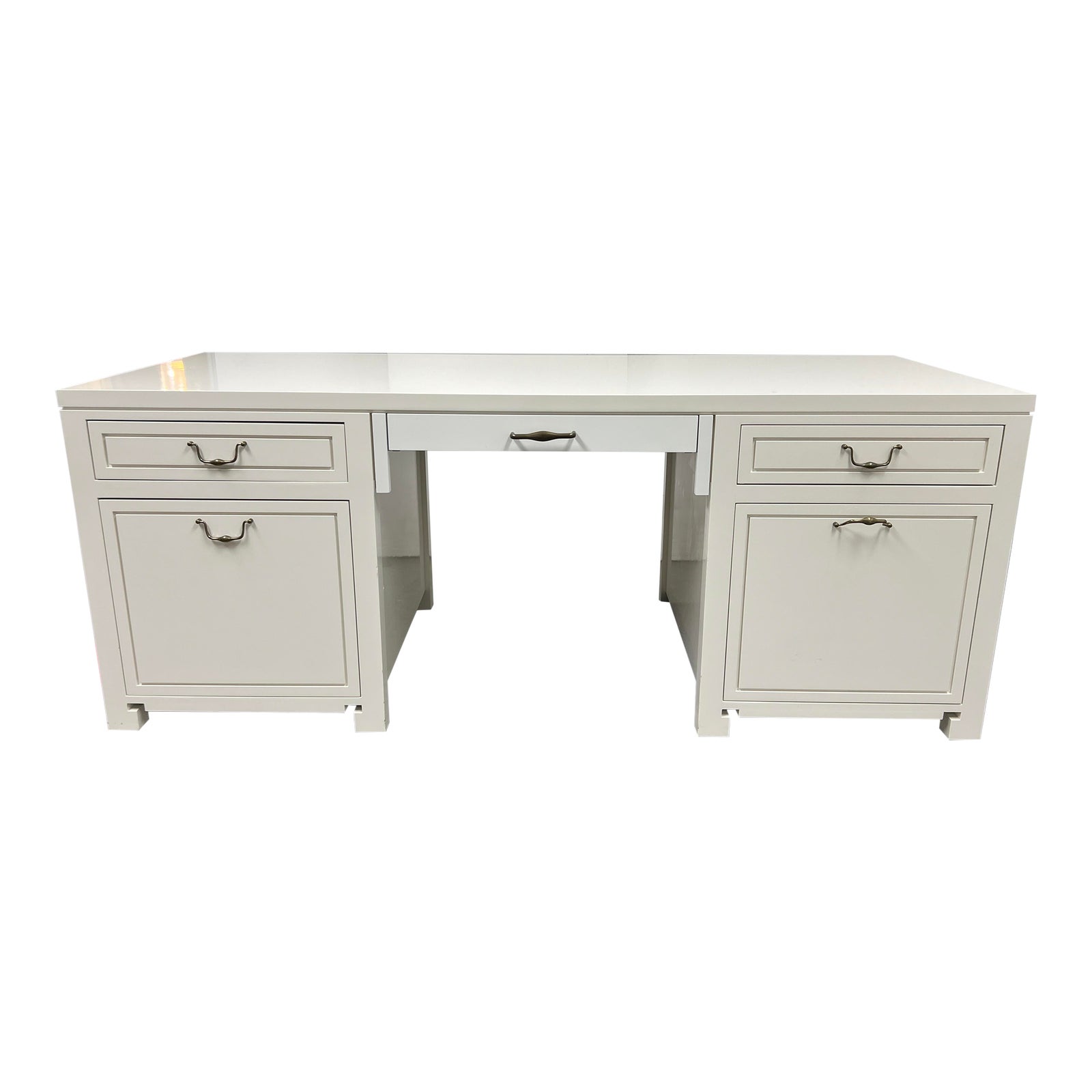 Design Plus Gallery presents an Executive Office Desk in an Antique White Lacquer. There are dual drawers on either side of the desk that mirror each other in shape. The central drawer pulls out and has been repaired/replaced recently. All knobs and pulls are of an antique brass finish. The drawers glide smoothly and have a casual traditional style. The desk is in good condition, with wear that is consistent with age + use.
