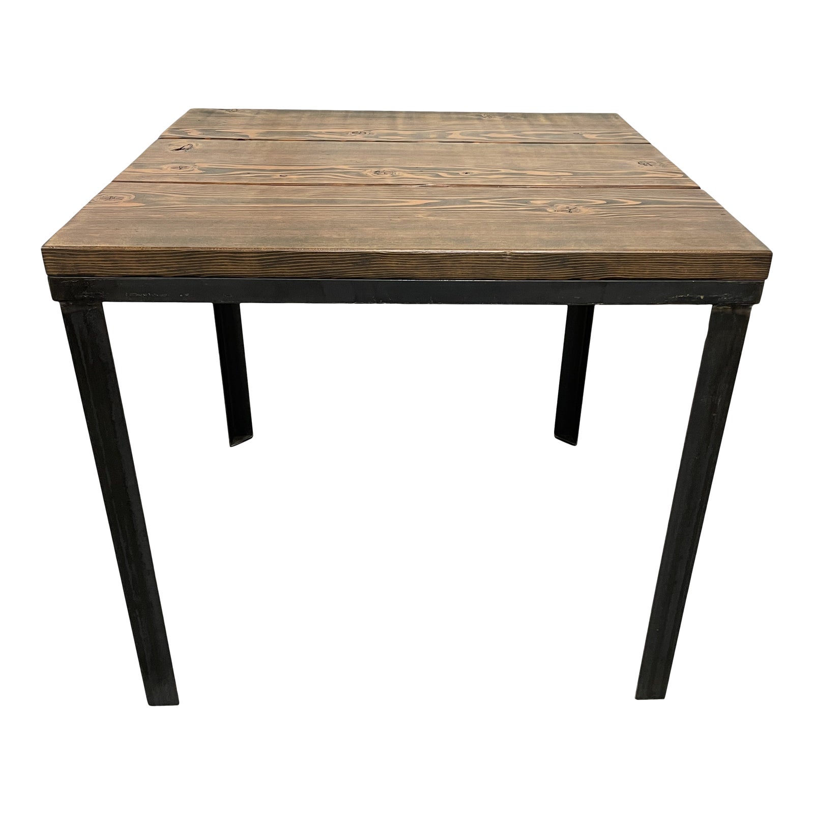 Design Plus Gallery presents a Custom Design Wood Plank Top + Iron Base Square Table. Perfect for a small nook in a kitchen or games table in a great room. Industrial and rustic vibes here would suit a cabin or any organic modern setting well. Steel base was welded together with the plank top with coordinating stain. Stain accents the dynamic wood grain. Visible wear through out, dining table is in good condition.