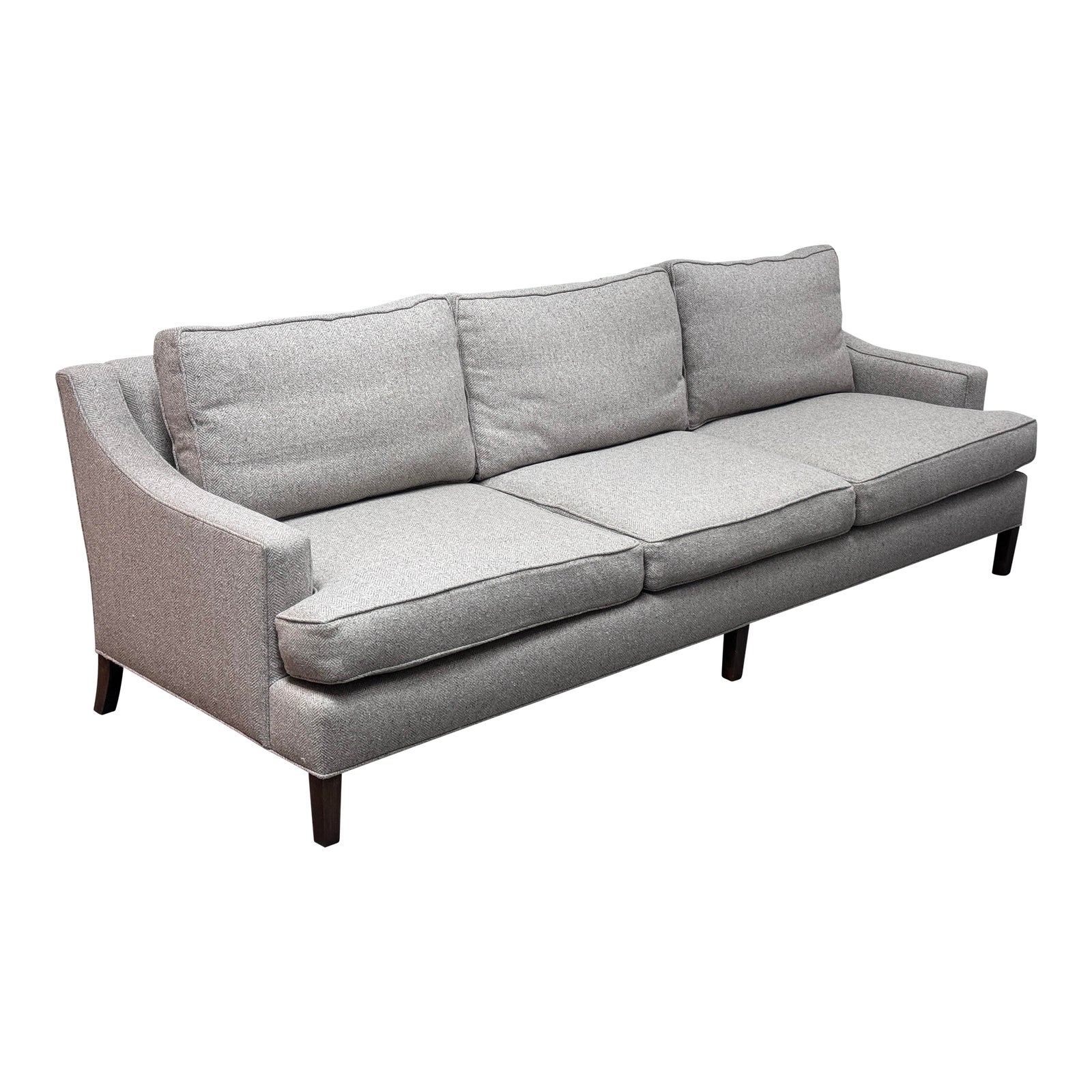 Design Plus Gallery presents a Custom Design Sofa. A sleek and modern three-seater piece with a unique design. It features three cushions over three cushions, providing ample seating space and comfort. The sofa has slope arms that adds a touch of elegance to the overall look, while clean lines give it a contemporary feel. The dark finish wood legs provide a sturdy base and contrast beautifully with the gray herringbone fabric upholstery. In good condition, minimal wear from usage. Made in USA.