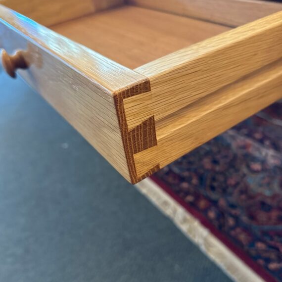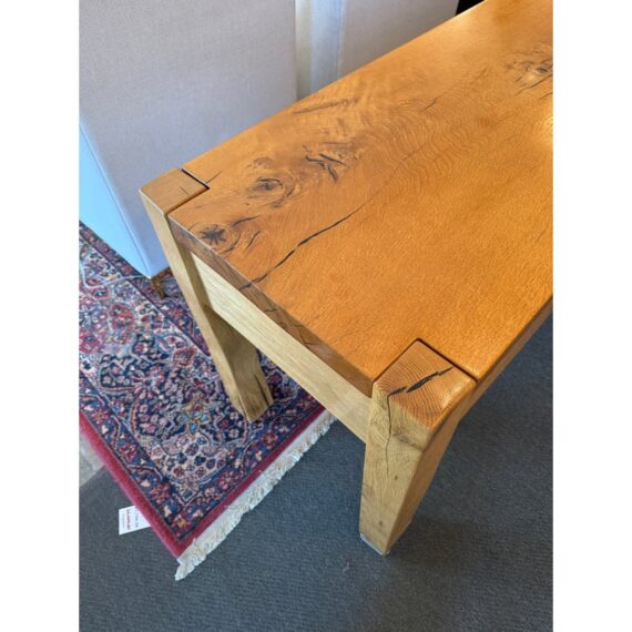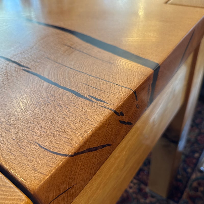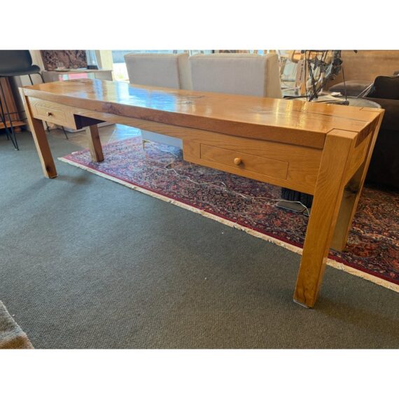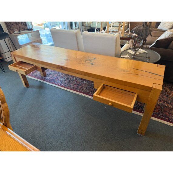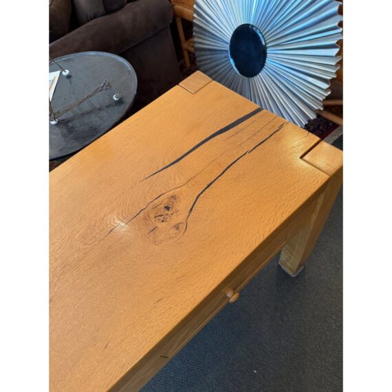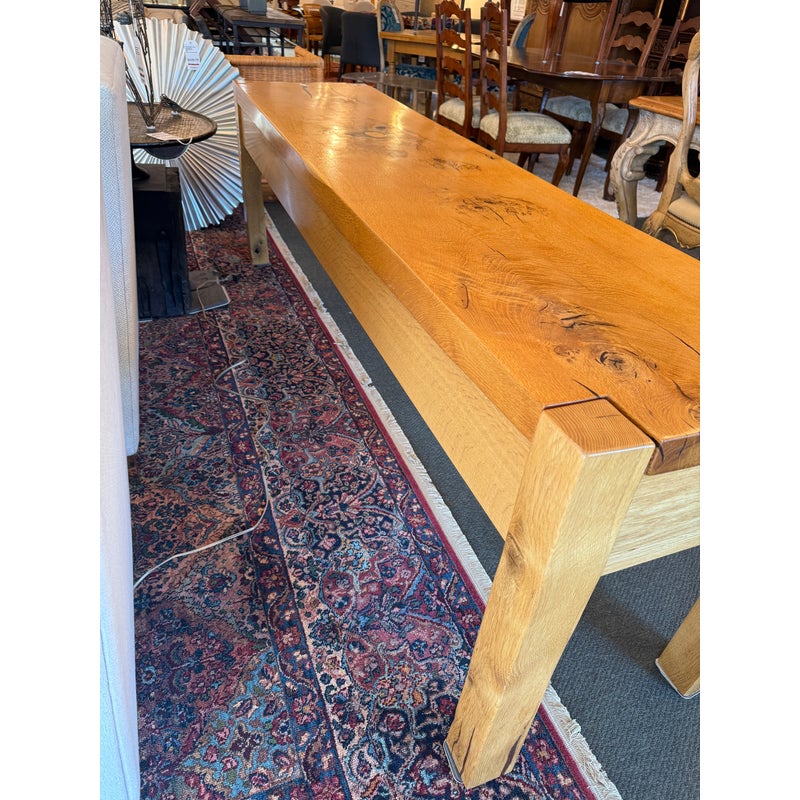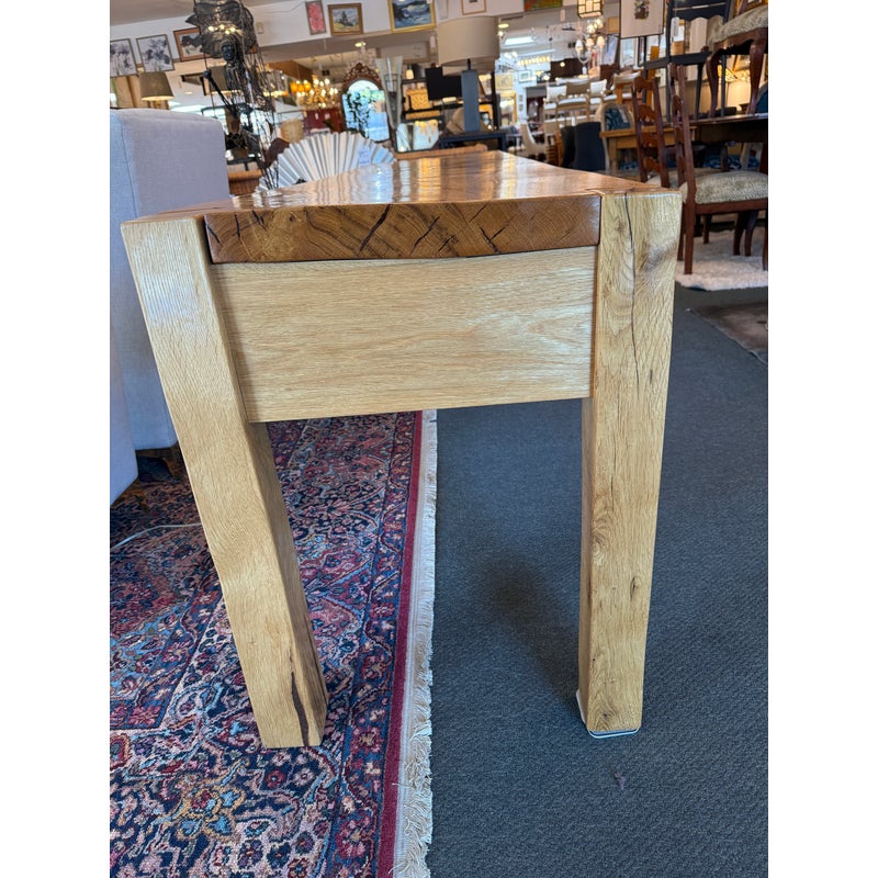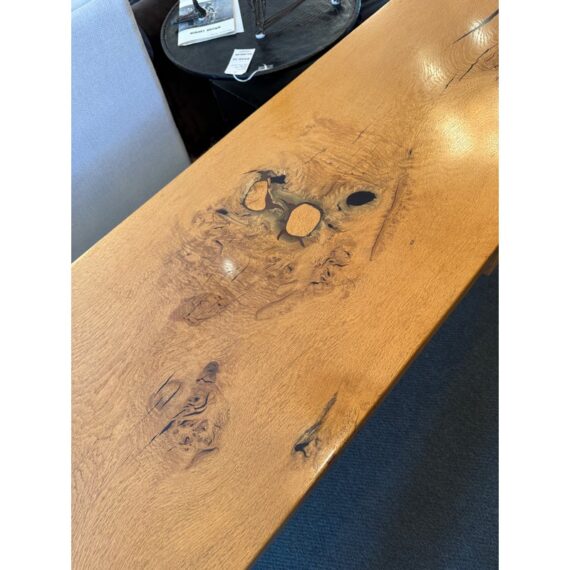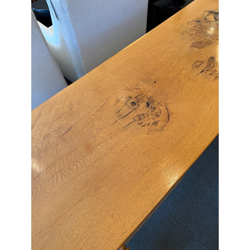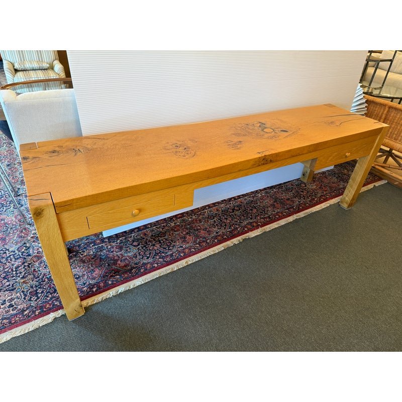 Design Plus Gallery presents a Custom Design Console. Designed for a Northern California Winery, the extra long table is handcrafted of solid oak with the whorls and knots beautifully preserved, and naturally occurring cracks supported with resin. Chunky square legs of solid oak support the heavy piece. Dovetailed details on the pair of deep drawers. Light surface wear; condition is good.