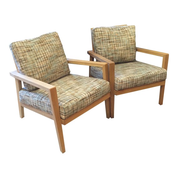 Design Plus Gallery brings us a pair of custom designed chairs that were made and upholstered in San Francisco. These low profile Danish style chairs are a must have. The wood is a birch wood color that compliment the unique, upholstered cushions. The fabric is a blue, cream, and chocolate brown woven designer fabric.