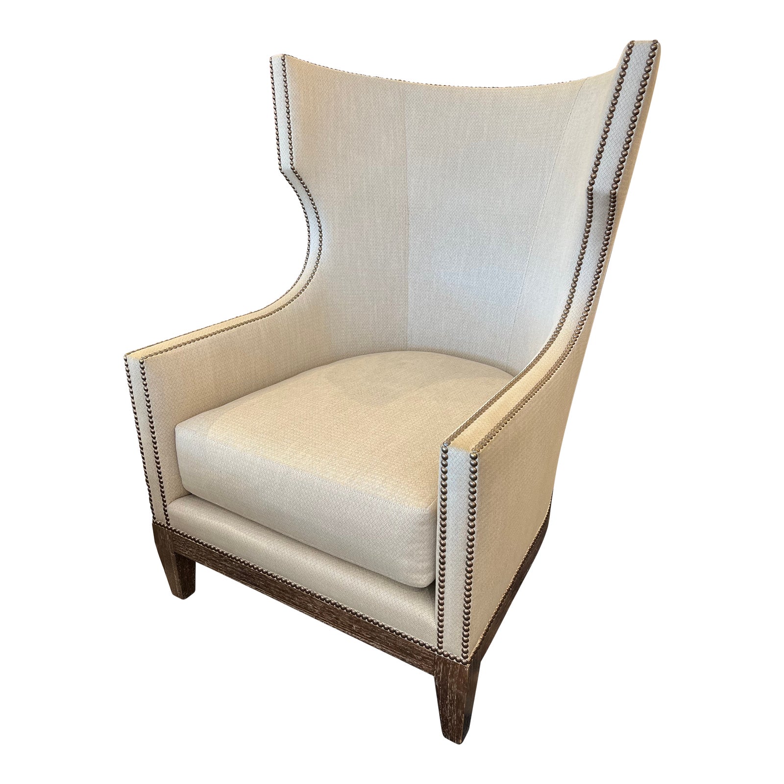 Design Plus Gallery has a Custom Designed Tule Lounge Chair. This Chair was designed by Ironies. Kate McIntye & Brad Huntzinger formed Ironies in the late 80’s. Being unable to find the environments and furnishings they envisioned, the designers set about creating them. Their early hand-painted business evolved into a full furniture line known for its unique designs, esoteric materials and comfortable, organic feeling. Noted design writer and lecturer Diane Seeks has called Kate & Brads work “some of the most elegant and creative designs to be seen in national showrooms. New products leap from their imagination like sparks of fire” . The frame of the chair is a washed dark finish, upholstered in a contemporary neutral cream fabric. The nailhead’s are a brushed antique finish