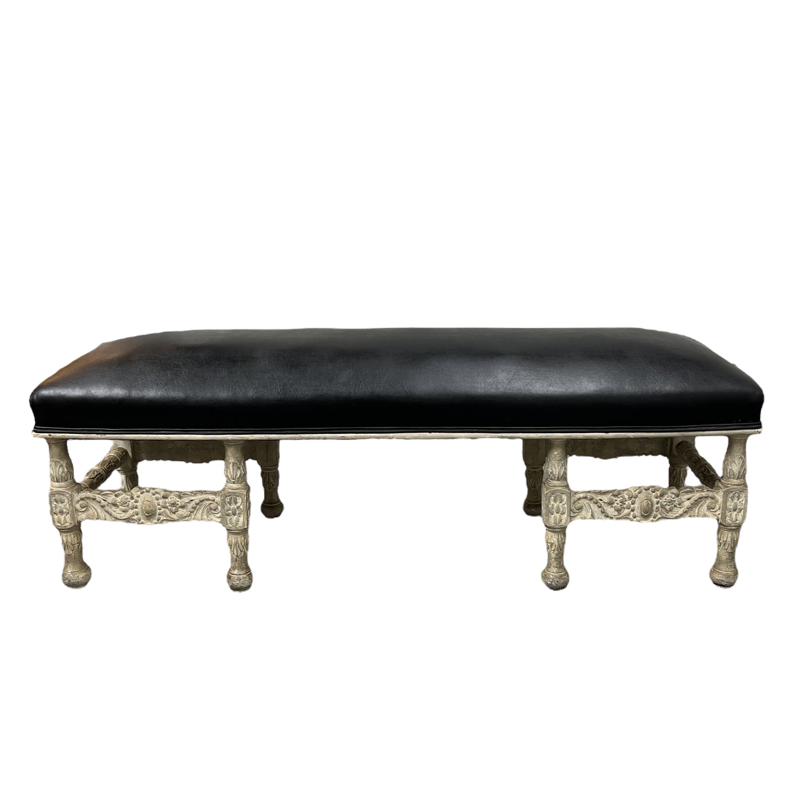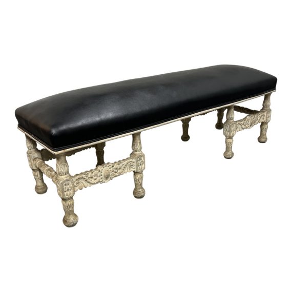 Design Plus Gallery presents a Custom English Bleached Seating Bench. Upholstered in black leather, the bench features a graceful and intricate carvings and ornate detailed base. The bench is in good condition, with wear that is consistent with age + use. The dust cover has two difference colors.
