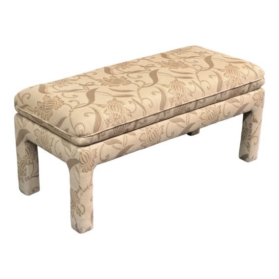 Design Plus Gallery presents a Custom Upholstered Bench. Deeply cushioned and wrapped in a neutral floral jacquard, this piece can find a home in many spaces. Pull up for extra seating at table, at entryway or foot of bed for comfortable function and style. Light surface wear is consistent with age and use.