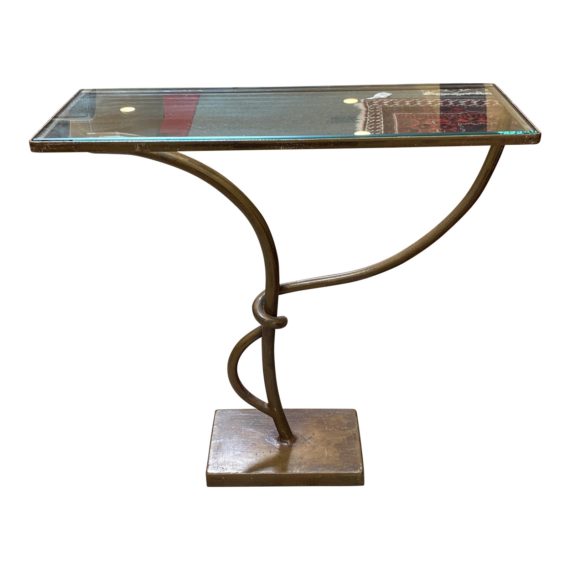 Design Plus Gallery presents a custom Accent Table. Forged of iron, the sinuous shape has a bronze finish for depth. Simple rectangles of glass lighten the table and provide ample space for a book, cocktail or cup of tea.