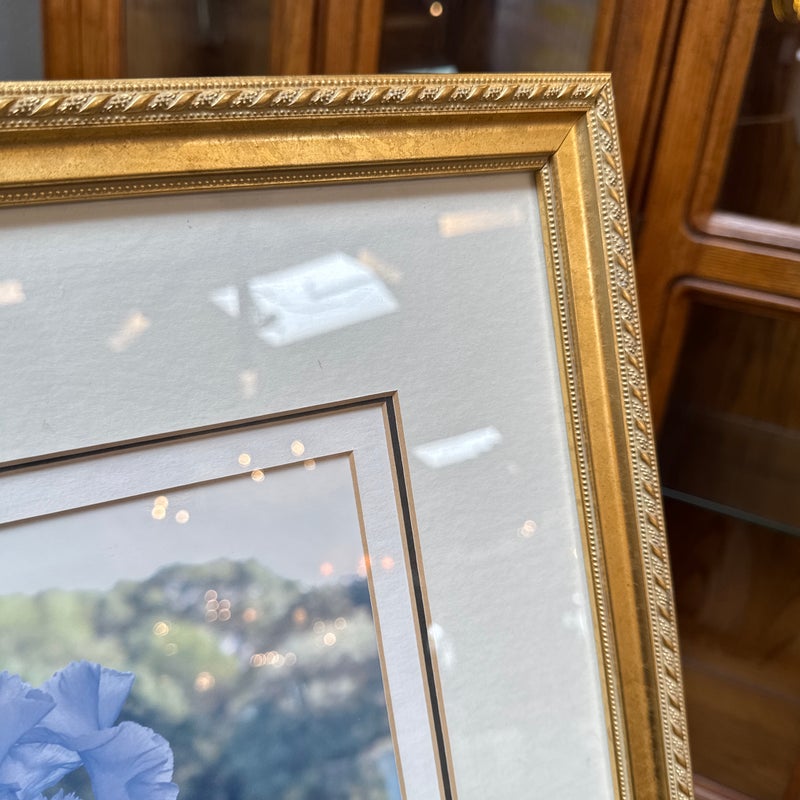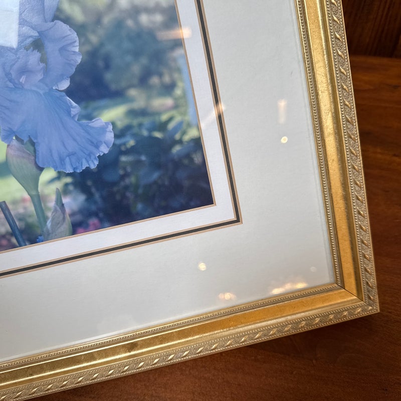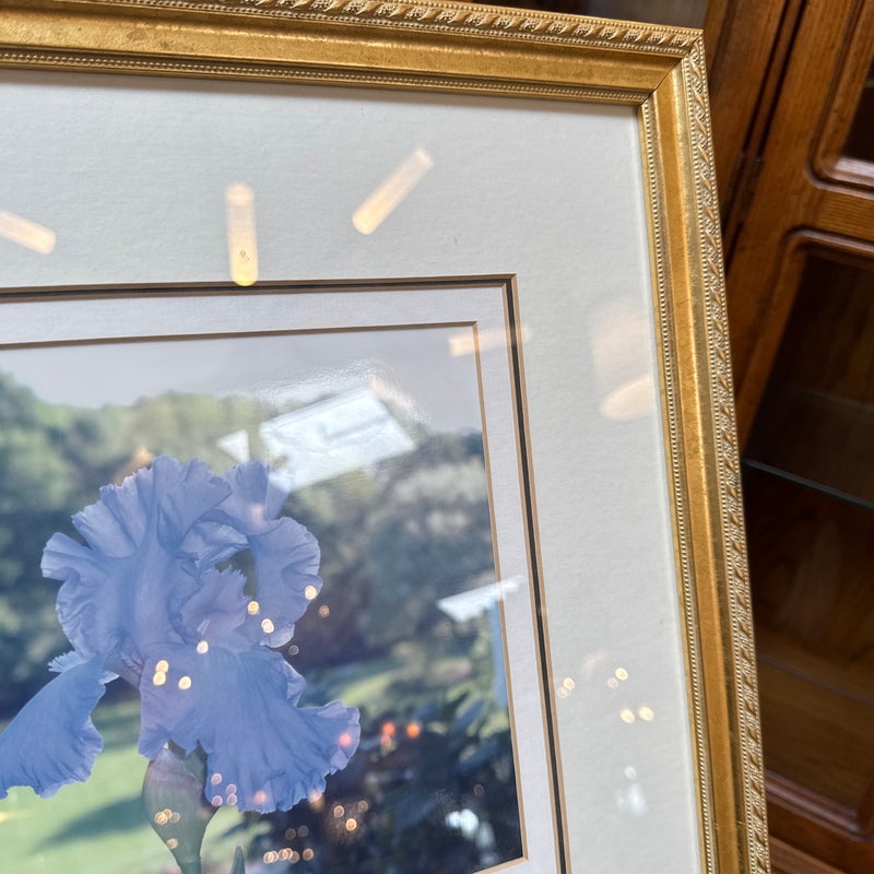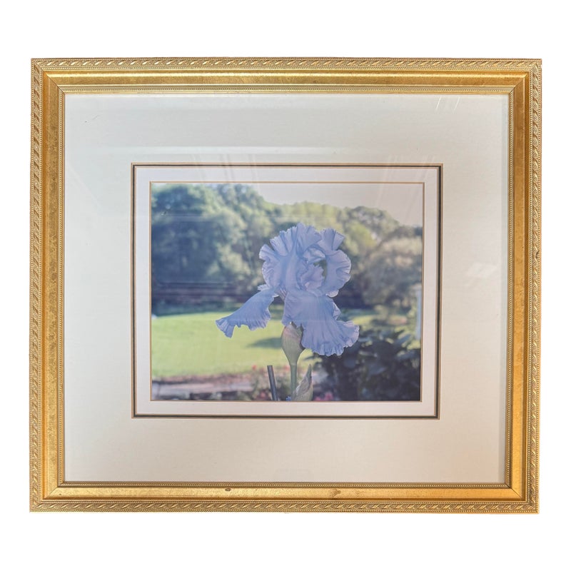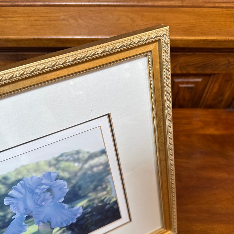 Design Plus Gallery presents a Custom Framed Floral Photograph. A single blue iris flower with a greenery background. The iris is the focal point, with the background blurred to emphasize the flower. The wood frame is in a gold finish with a decorative pattern. In good condition, minimal wear.