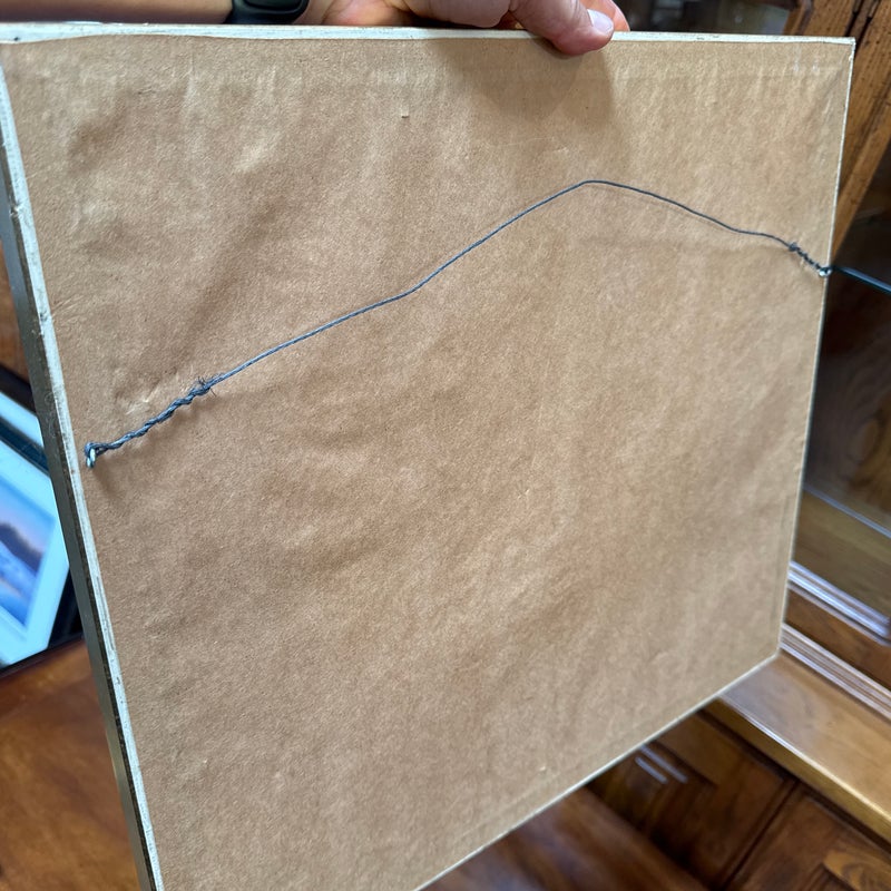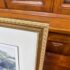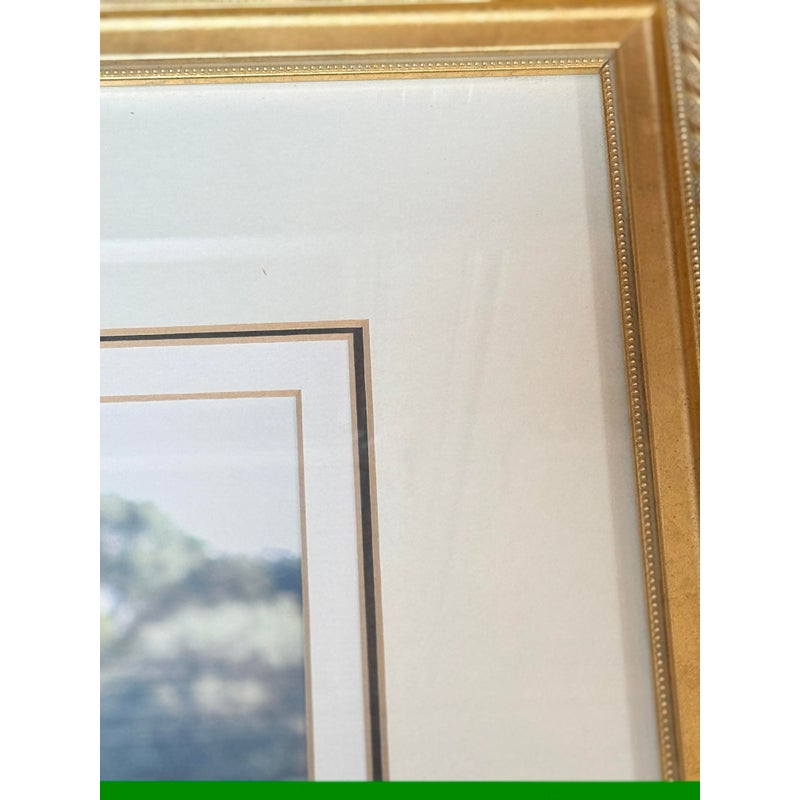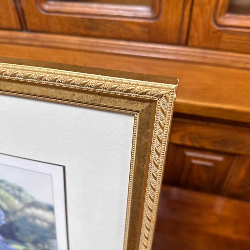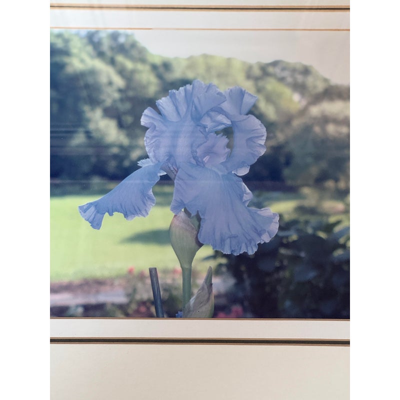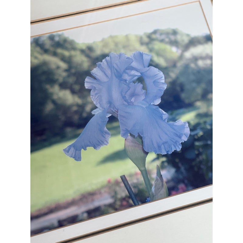 Design Plus Gallery presents a Custom Framed Floral Photograph. A single blue iris flower with a greenery background. The iris is the focal point, with the background blurred to emphasize the flower. The wood frame is in a gold finish with a decorative pattern. In good condition, minimal wear.