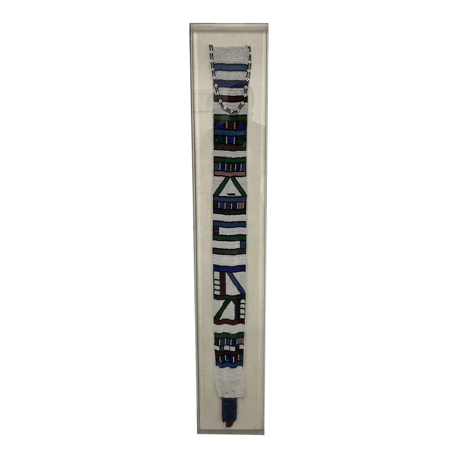 Design Plus Gallery presents a Custom Framed Ethnic Beaded Belt in Acrylic Box. This colorful belt features geometric accents is constructed with an abundance of beads. It is framed over white and secured in an acrylic box for presentation. Minor wear from age and use; belt is in good condition.