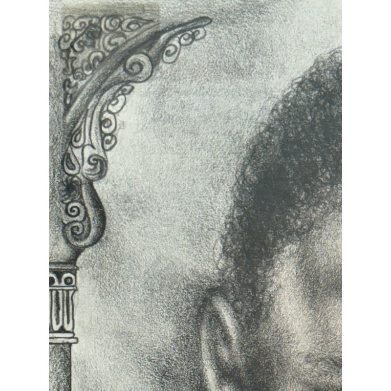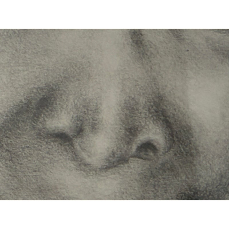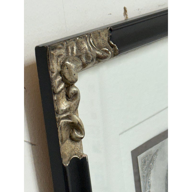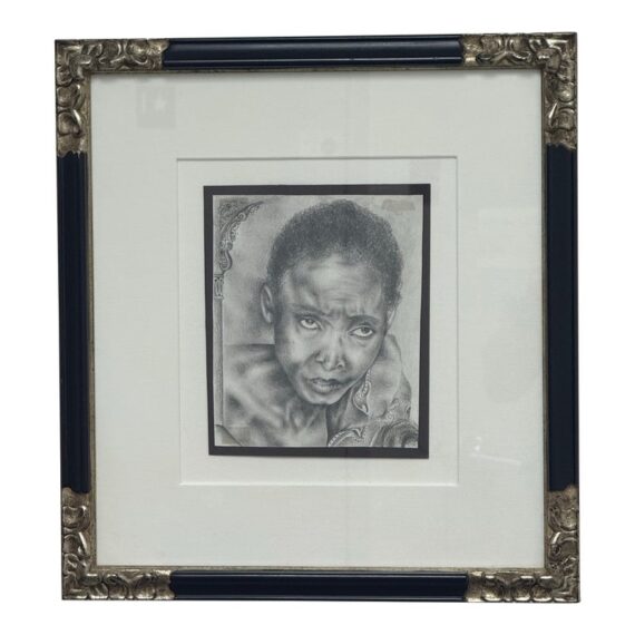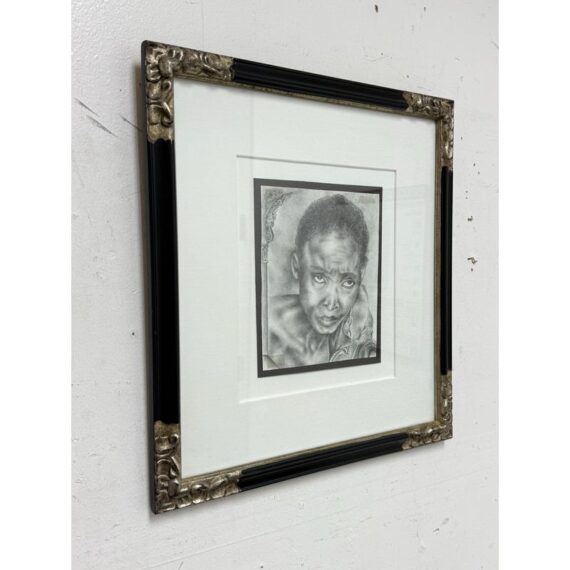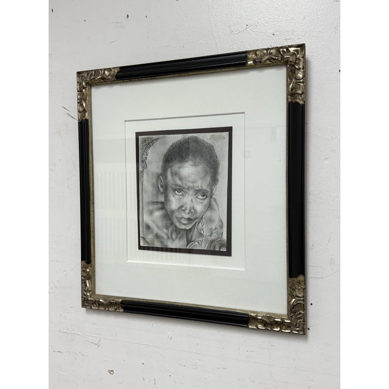 Design Plus Gallery presents a Custom Framed Female Portrait. The identity of the woman is unknown rendered in charcoal and graphite on textured paper. The subject is shown in a quiet three-quarter view, her gaze lowered slightly as if caught between thought and breath. Soft, velvety charcoal blocks define the hair and the shadowed right side of the face, while fine pencil lines pick out the eyelashes, brows, and the tender curve of the lips. Eraser-lifted highlights along the left cheekbone and the bridge of the nose give the skin a gentle luminosity against a smudged, smoky background. The shoulders dissolve into loose, gestural marks, allowing the face to hold the moment. Presented in a custom black frame with silver corner accents and a clean white mat that adds air around the portrait. In good condition, visible and minimal wear.