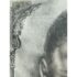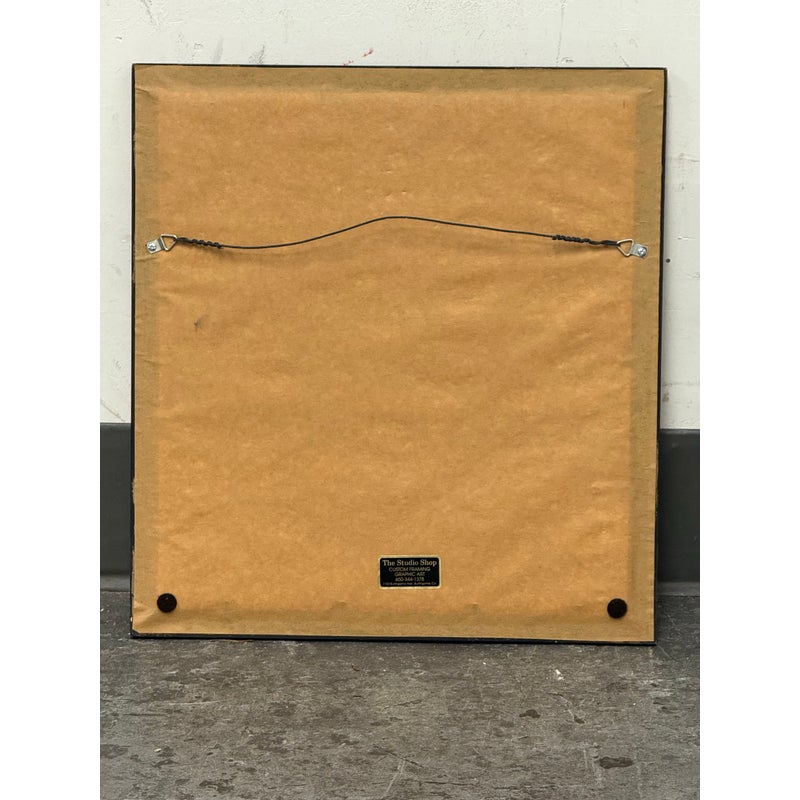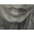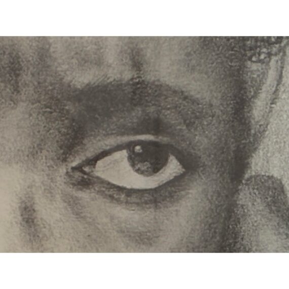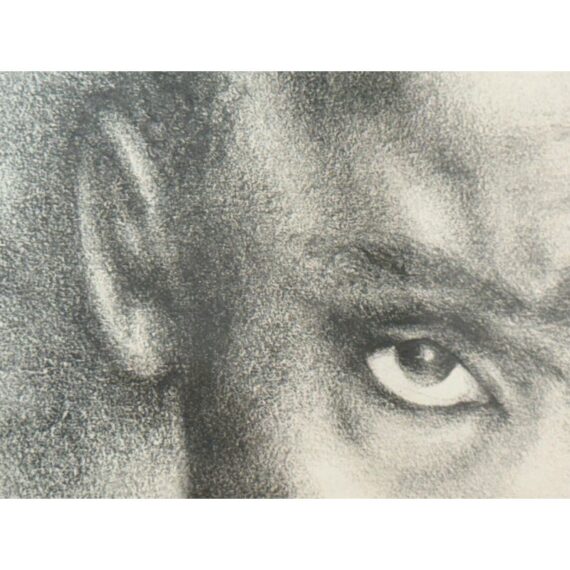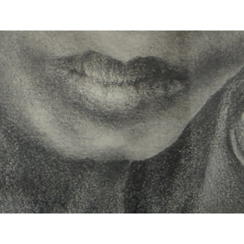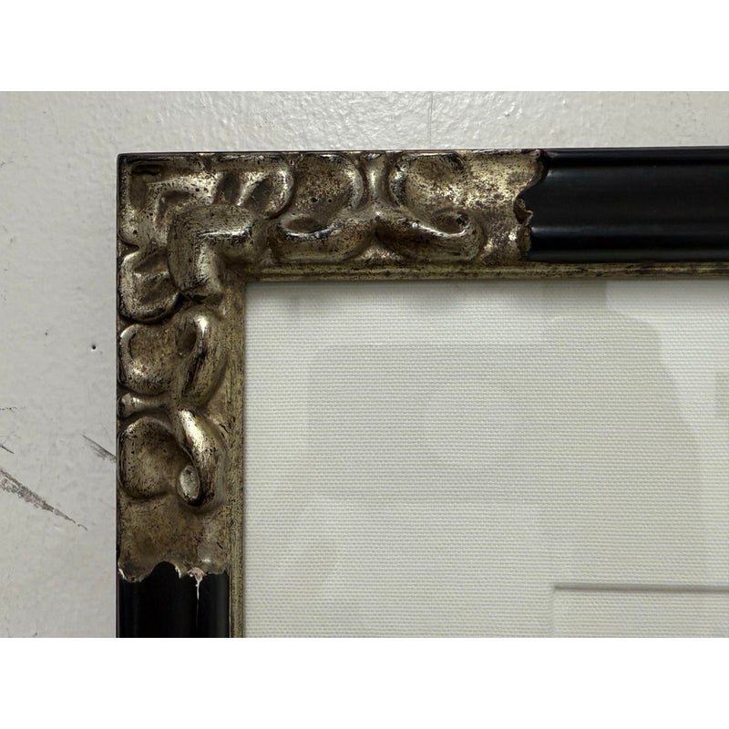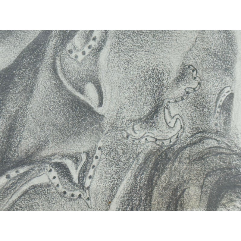 Design Plus Gallery presents a Custom Framed Female Portrait. The identity of the woman is unknown rendered in charcoal and graphite on textured paper. The subject is shown in a quiet three-quarter view, her gaze lowered slightly as if caught between thought and breath. Soft, velvety charcoal blocks define the hair and the shadowed right side of the face, while fine pencil lines pick out the eyelashes, brows, and the tender curve of the lips. Eraser-lifted highlights along the left cheekbone and the bridge of the nose give the skin a gentle luminosity against a smudged, smoky background. The shoulders dissolve into loose, gestural marks, allowing the face to hold the moment. Presented in a custom black frame with silver corner accents and a clean white mat that adds air around the portrait. In good condition, visible and minimal wear.