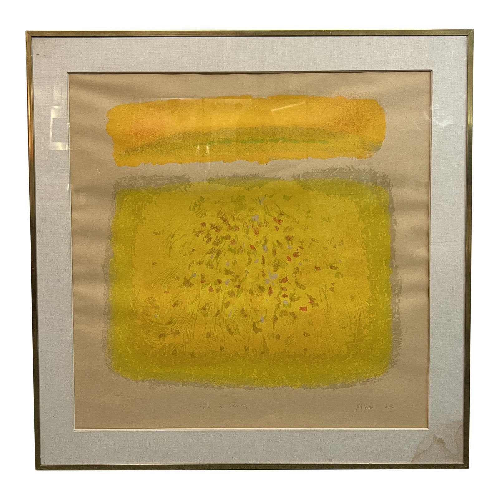 Design Plus Gallery presents a “The Earth’s Spring” Artist’s Proof by HIRSS. Signed by the artist in the lower right corner and signified with an “A.P.” for Artist’s Proof. These are rare and preliminary test runs for lithograph or screen print series. Two breaths of yellow form a horizon with the backdrop of the paper. Paper is slightly wrinkled, art piece is in good condition. Framed in a brass frame. Water damage on lower right corner.