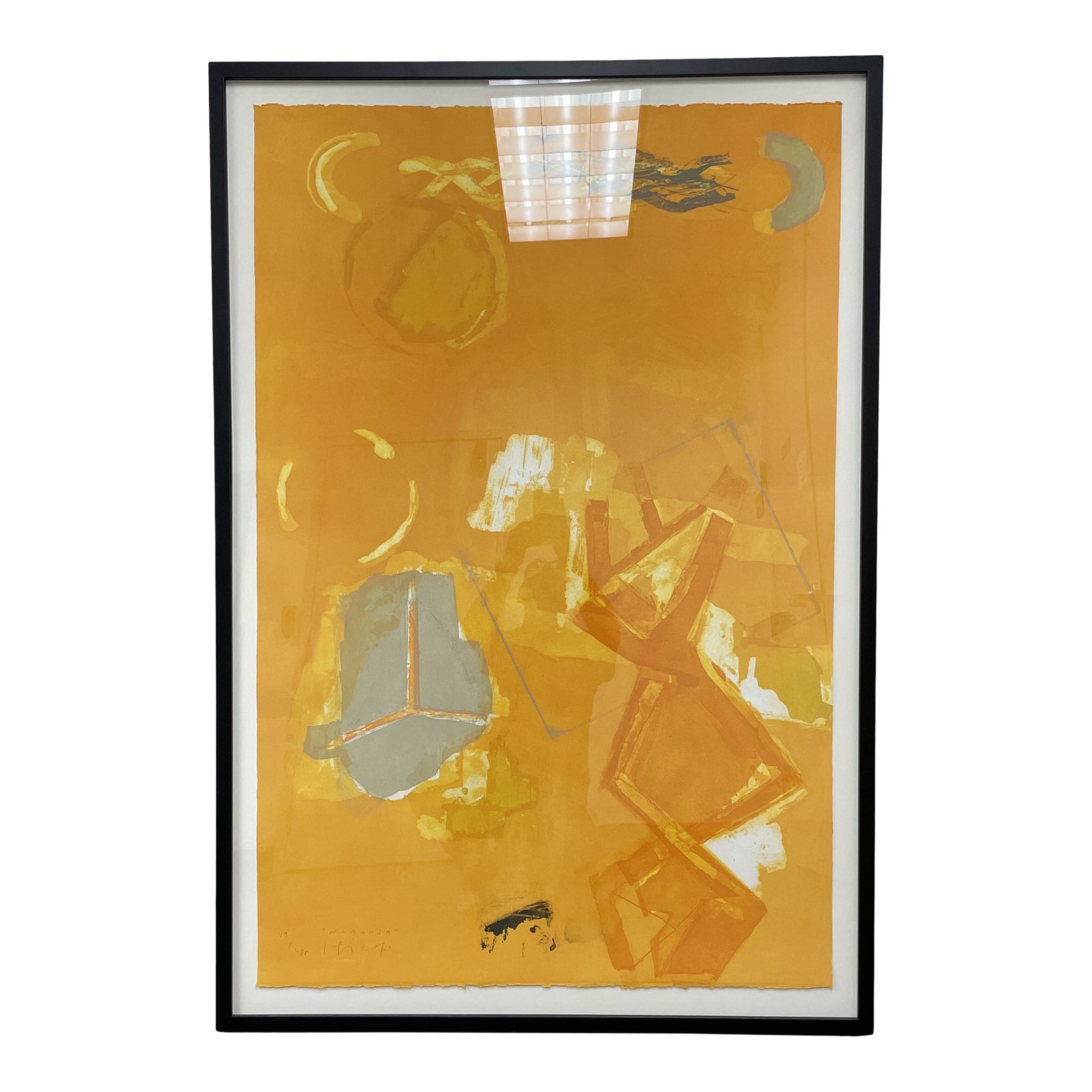 Design Plus Gallery presents a Custom Framed “Naranja” Print – Signed + Numbered 19/45. Vibrant mustard and orange tones are intermixed with graphite and gray fields. Signed and numbered by the artist in the lower left corner. The limited edition print is framed in a floating fashion to showcase the edge of the paper. Ivory back with a black frame contrast beautifully. Minor wear through out, art piece is in good condition. Framed with a protective UV glass.